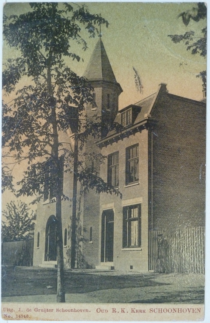 Prentbriefkaart met oud katholieke kerk St. Bartholomeüs aan de Wal te Schoonhoven