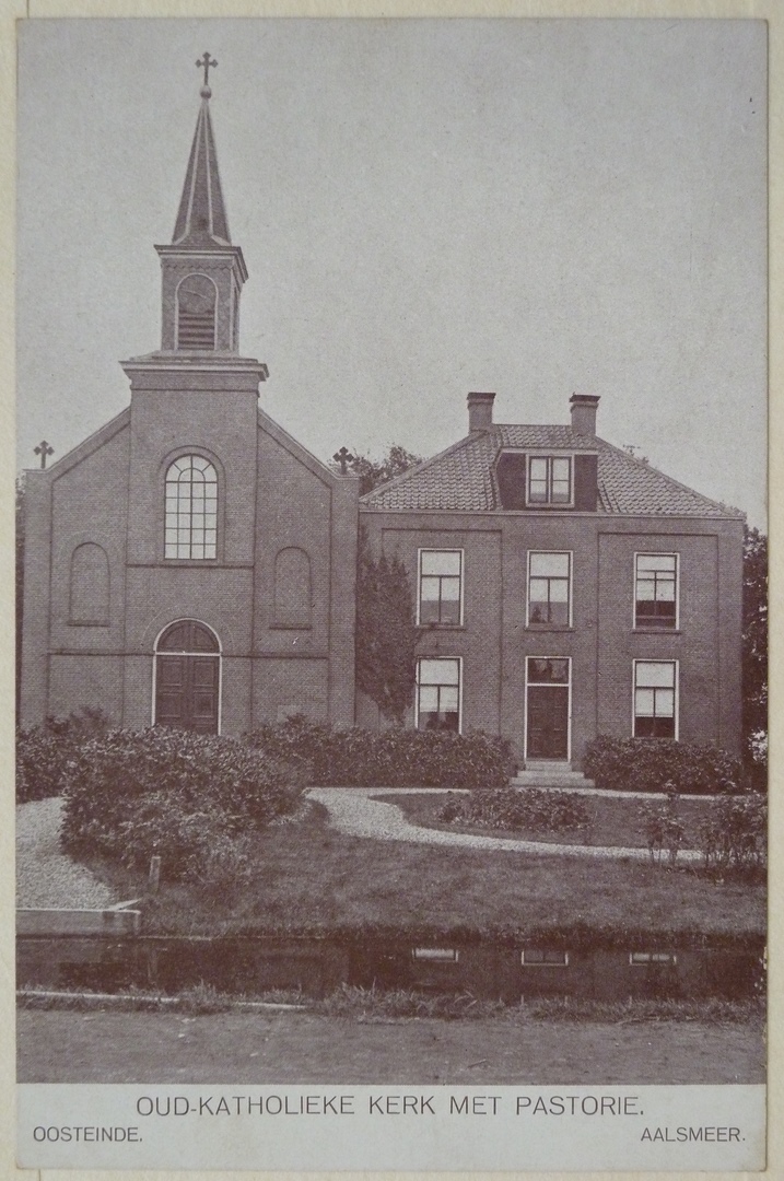 Prentbriefkaart met oud katholieke kerk Petrus en Paulus met pastorie, Oosteinder weg te Aalsmeer