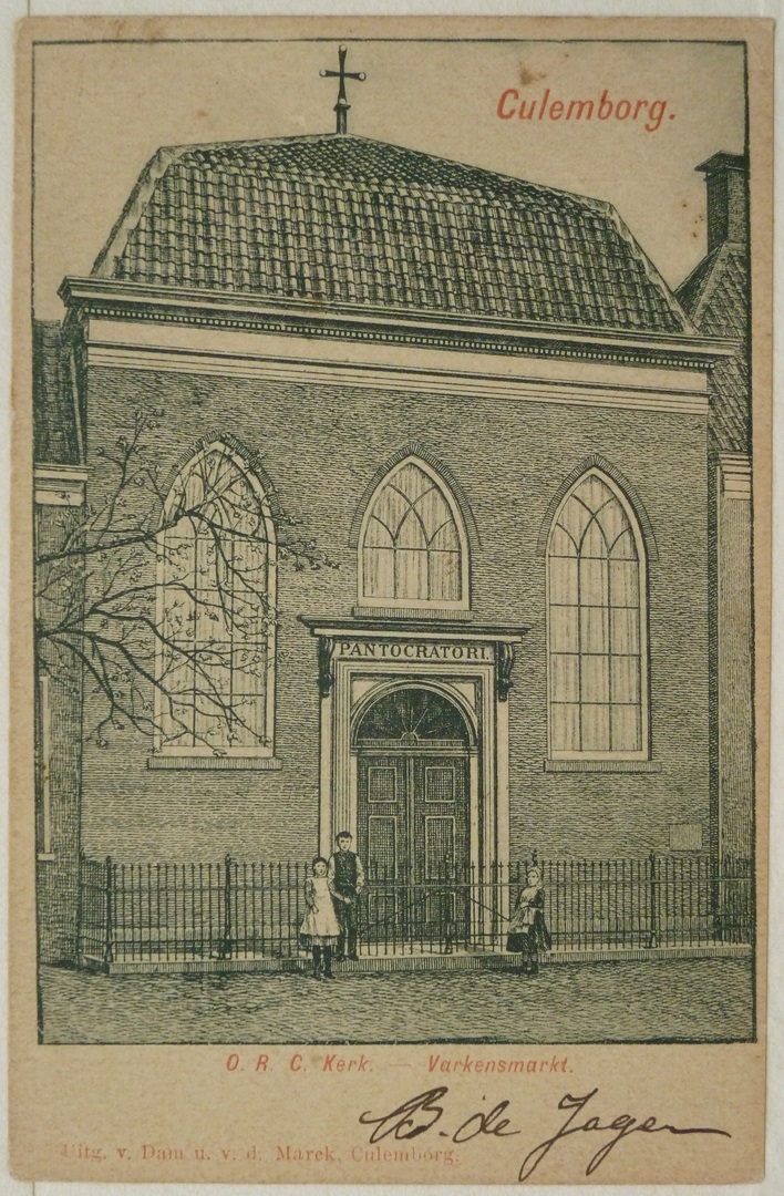 Prentbriefkaart met oud katholieke kerk HH. Barbara en Antonius, Varkensmarkt te Culemborg