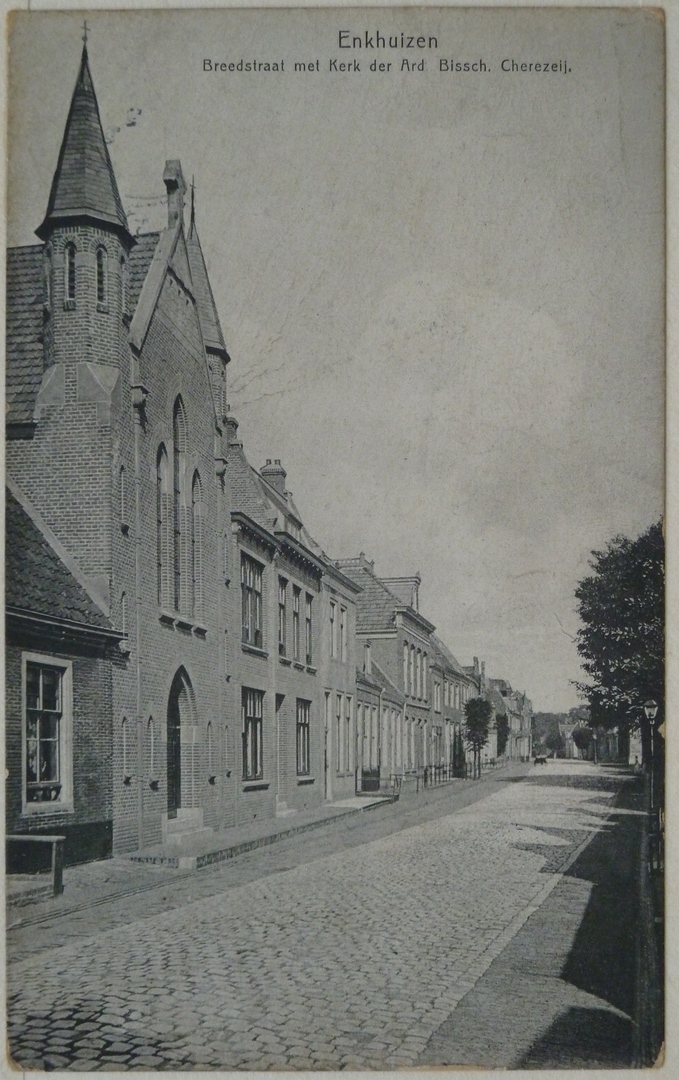 Prentbriefkaart met oud katholieke kerk St. Gummarus en Pancratius, Breestraat te Enkhuizen