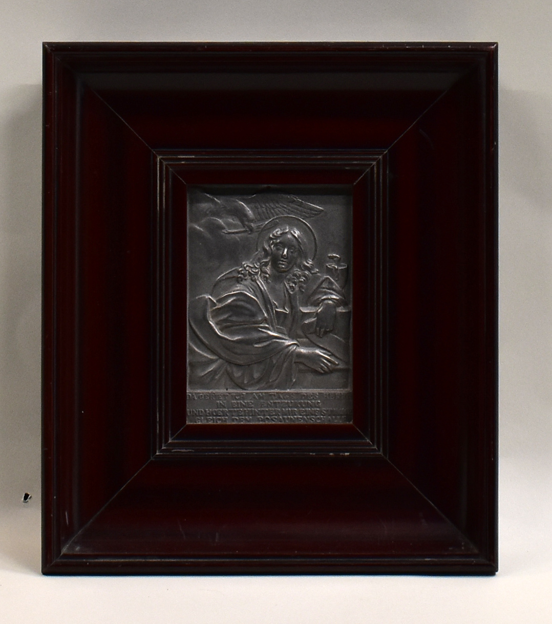 Ingelijst reliëf van Johannes Evangelist met adelaar en gifkelk, met "Da geriet ich am Tage ..."