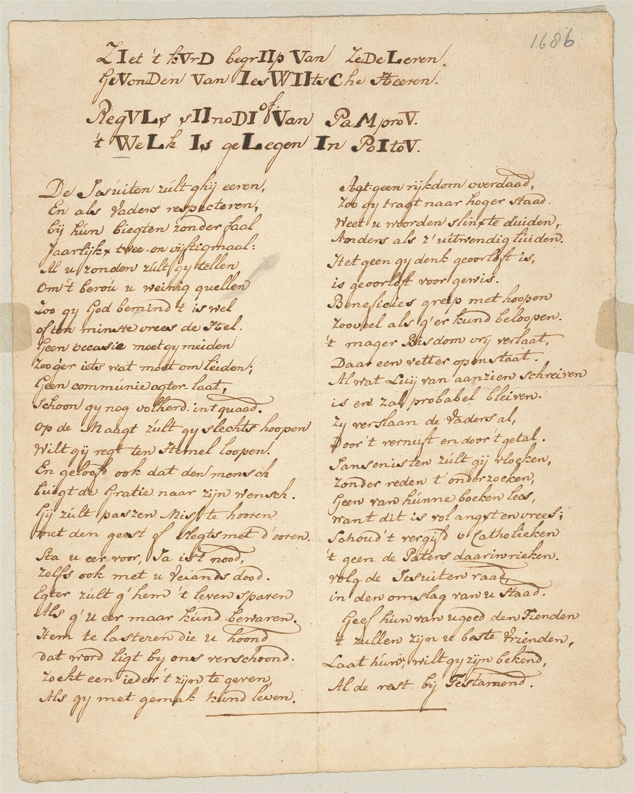 Tijdvers "ZIet 't kVrD begrIIp Van zedeLeren. geVonden van Ies WIItsChe heeren. RegvLs sIInodI of Van paMproV. 't weLk Is gelegen In poItoV", met gedicht "De Jesuieten zult ghij eeren ..."