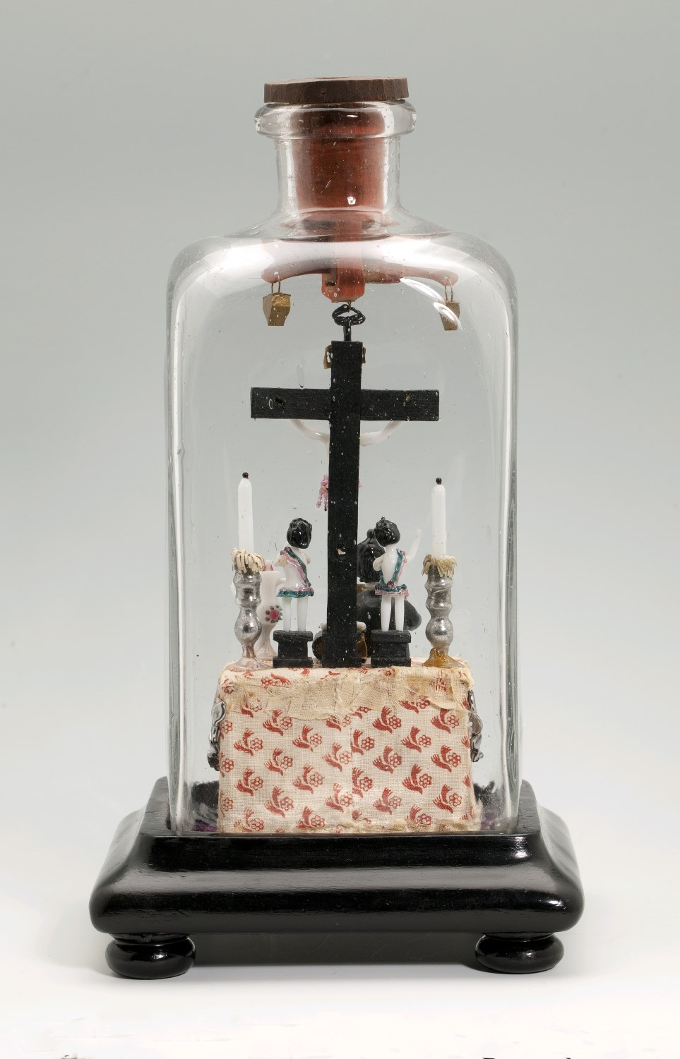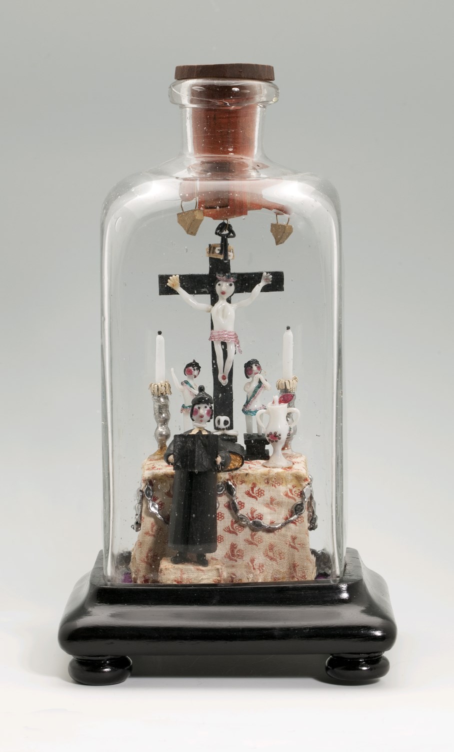 Vierkante fles zonder bodem op houten voet met priester voor altaar waarboven gekruisigde Christus