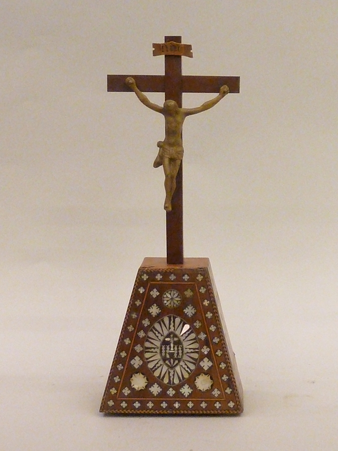 Crucifix met koperen corpus, notenhouten voetstuk met nijptang, nagels en hamer