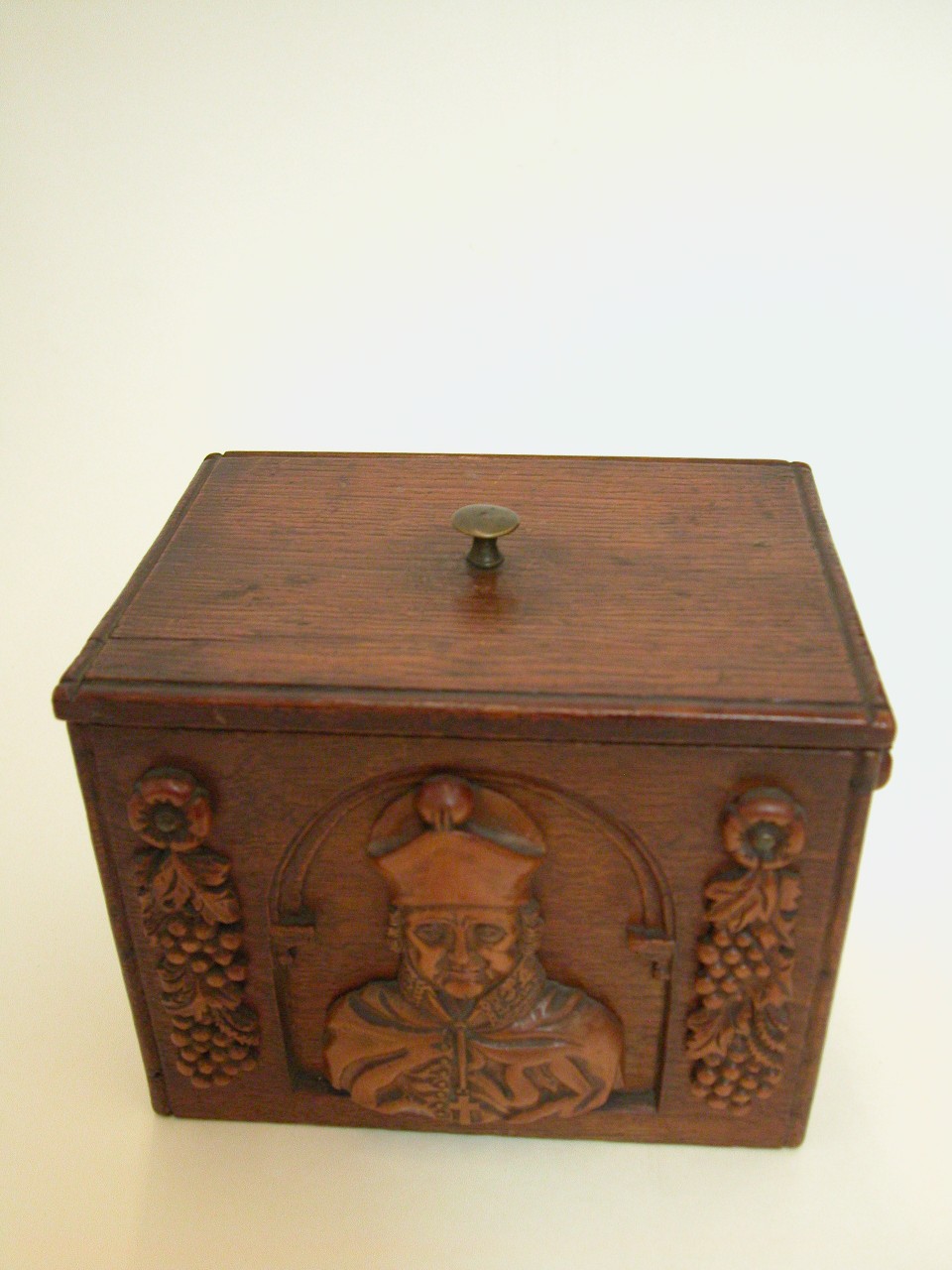 Tabaksdoos versierd met snijwerk, voorop buste aartsbisschop Van Santen, met Jansenius en Quesnel
