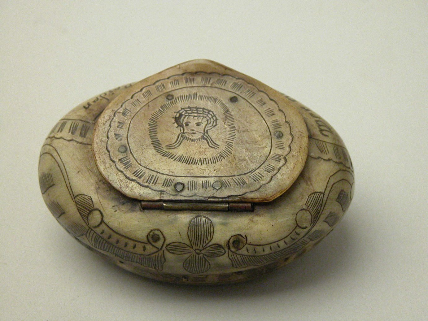 Ovaal snuifdoosje, op deksel Christus met doornenkroon, met Duitse tekst