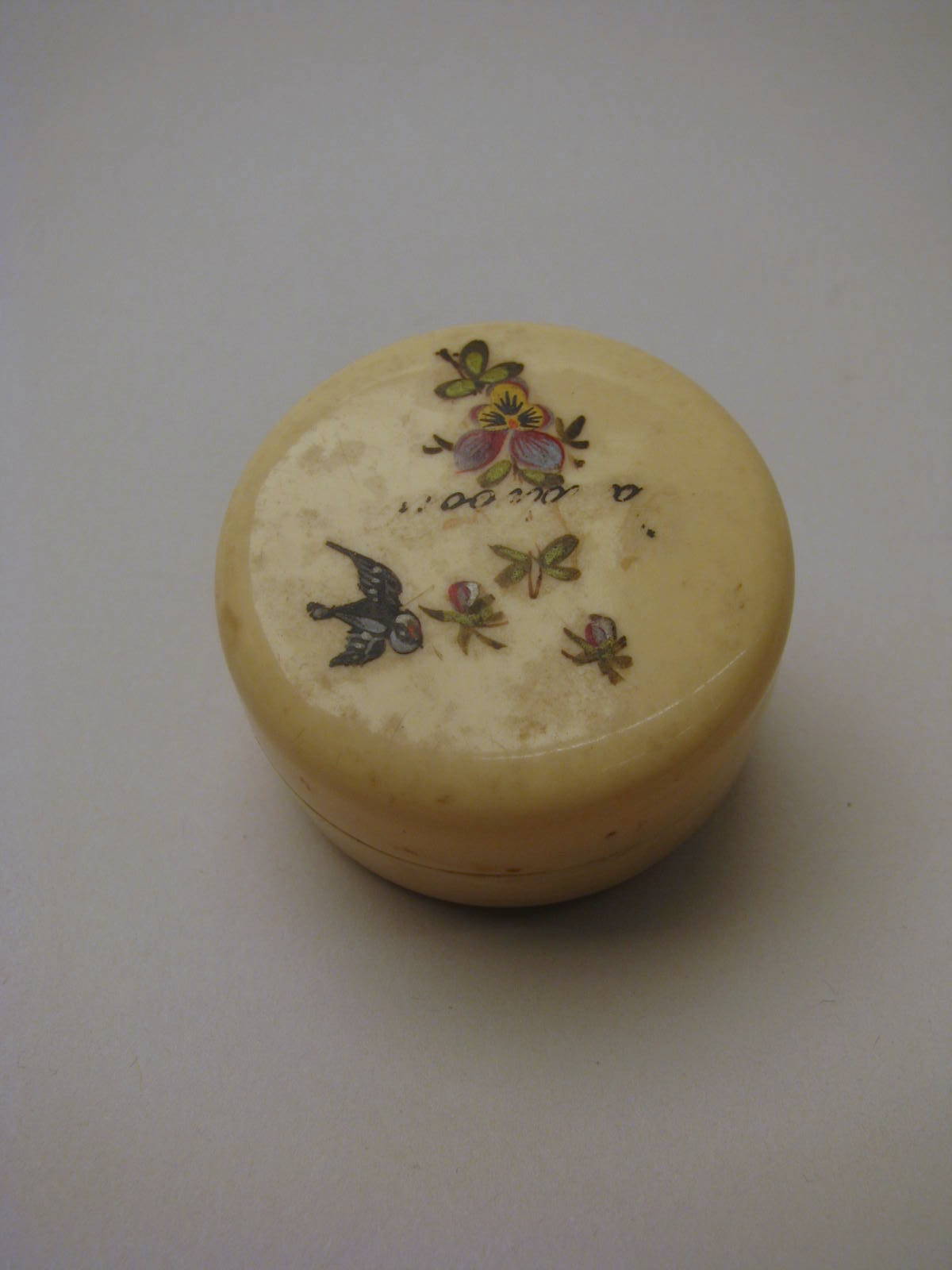 Rond doosje met op deksel plakplaatje waarop gekleurde bloemen en een vogel