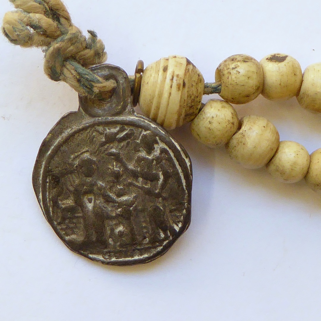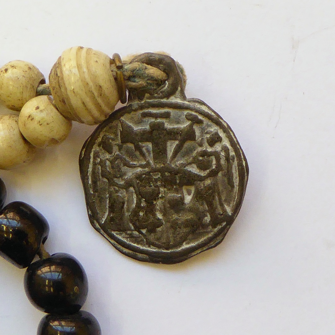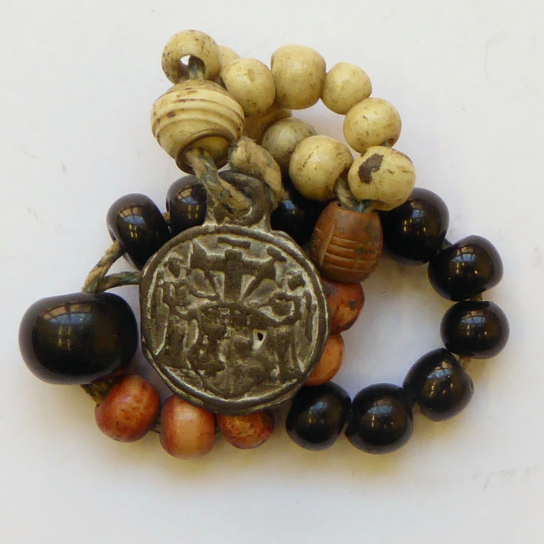 Rozenkrans met zwarte, rode en witte kralen, met loden penning waarop annunciatievoorstelling