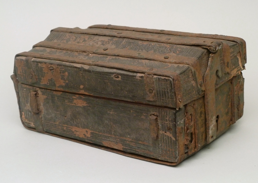Kistje bekleed met bewerkt leer, waarin een rankenornament is gestempeld, met vijf ijzeren banden