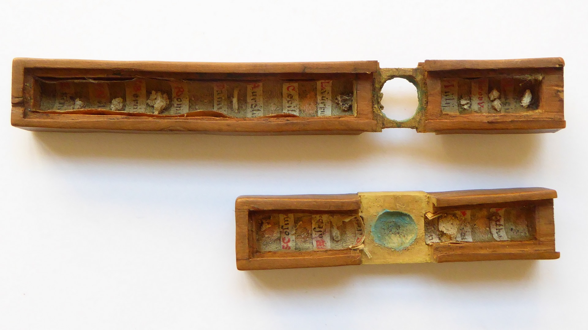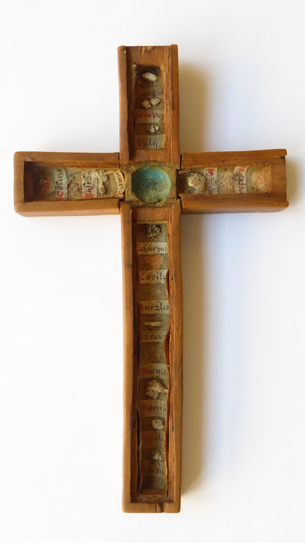 Reliekkruisje, geheel uitgehold en opgevuld met relieken