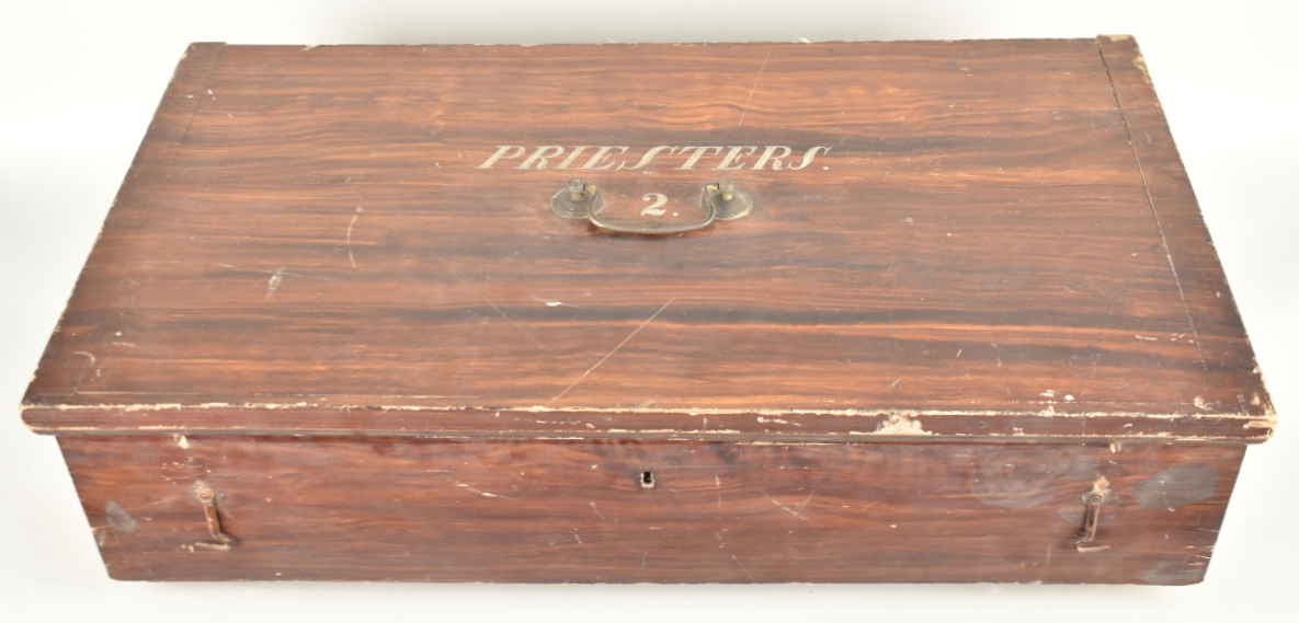 Model van de tabernakel: bruin geschilderde houten foedraal voor vier poppen met "Priesters 2." op deksel. In de foedraal voor elk beeld een vak, met geschreven etiketten: "Abia", "Sechanja", Eljasib" en "Harim"
