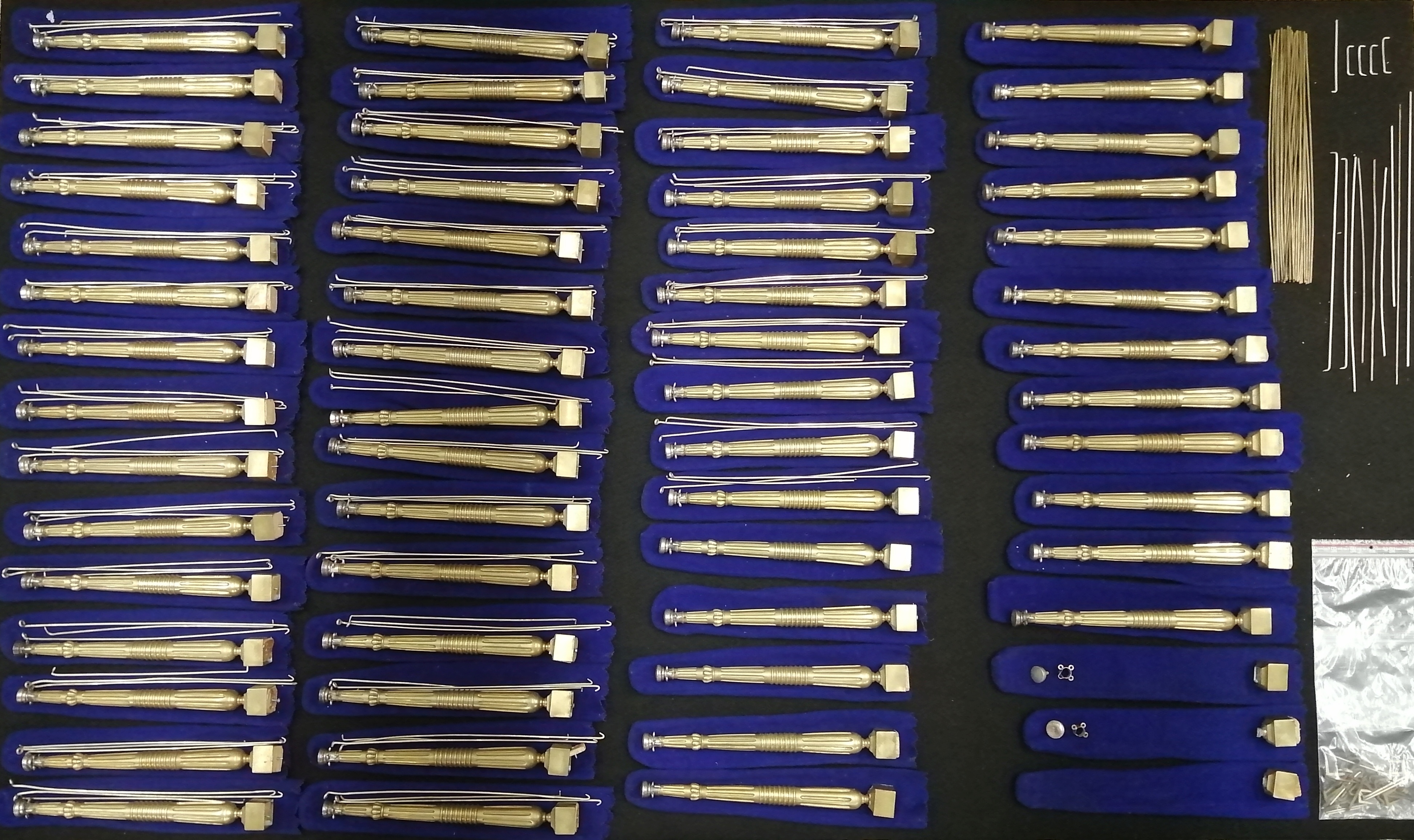 Model van de Tabernakel van ds. Leendert Schouten: de zuilen, scheerlijnen, verbindingsstaven en roedes van de omheining van de voorhof, met paarse hoezen