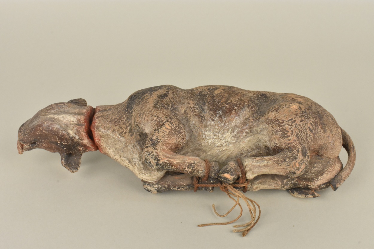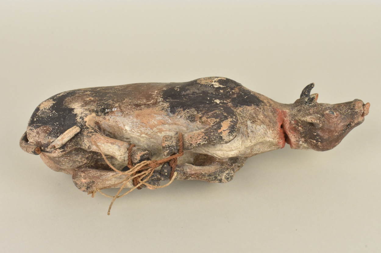 Model van de tabernakel: geslacht rund in de voorhof van de tabernakel, met touw om de poten