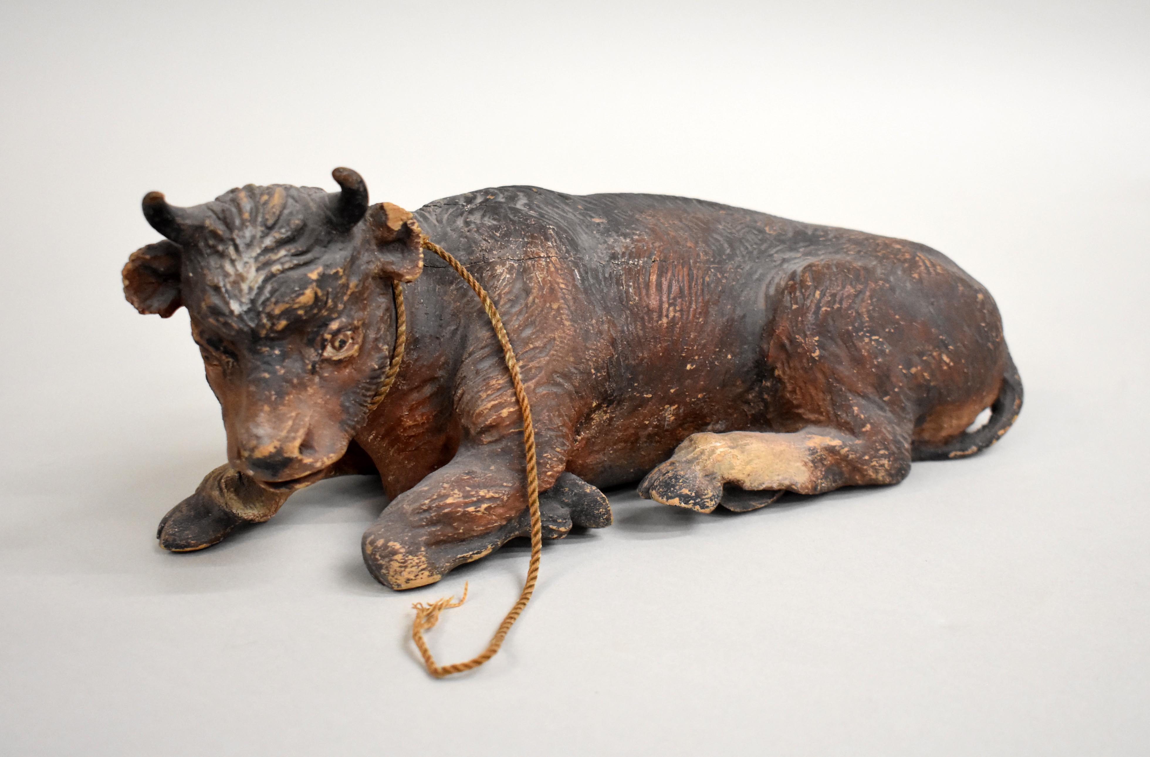 Model van de tabernakel: liggend roodbruin rund met touw om de hals