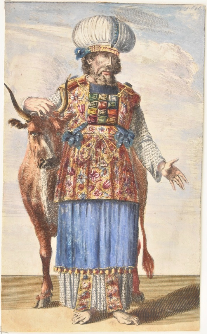 Aäron, afgebeeld als hogepriester met stier, rechtsboven met "pag. 646", ingekleurd