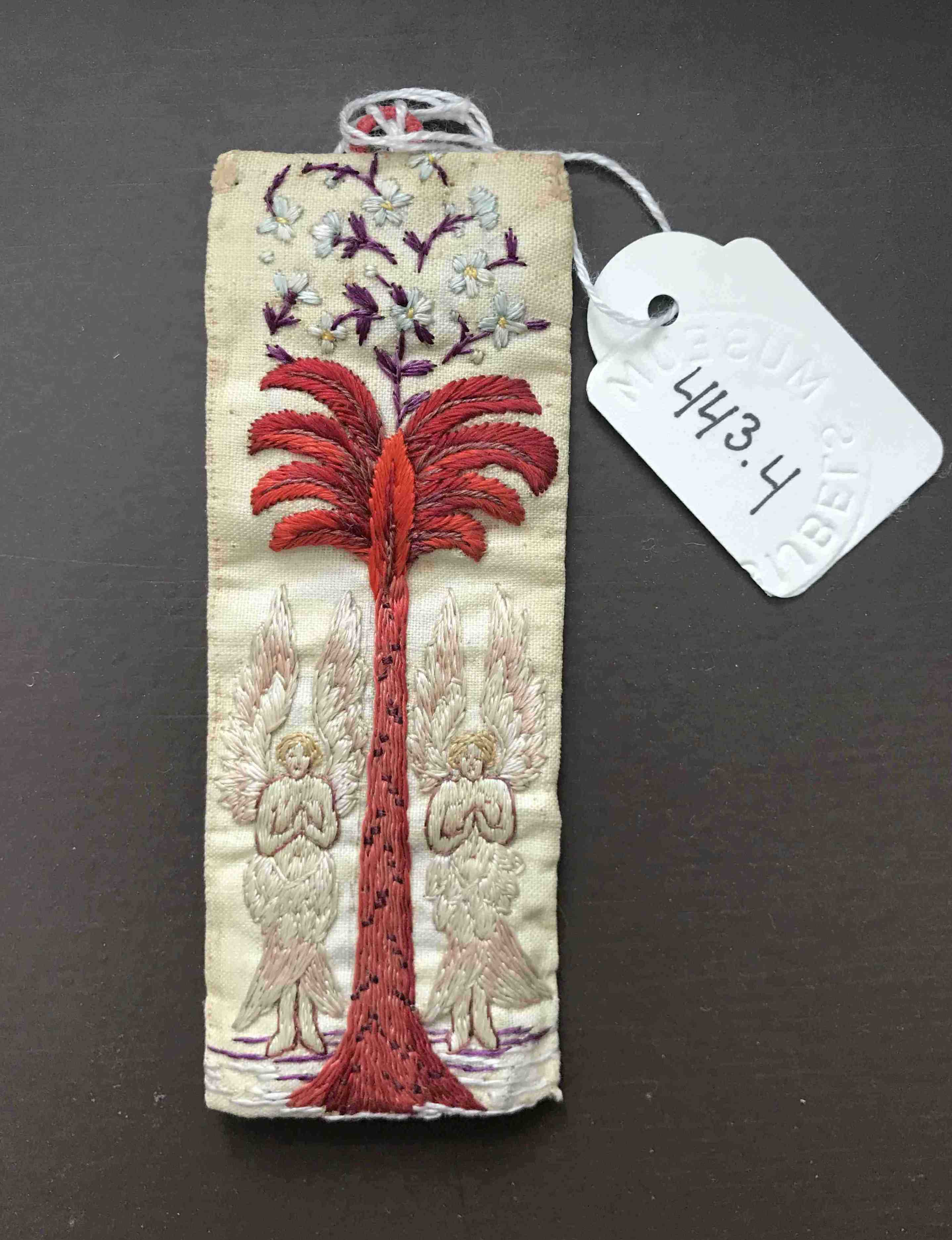 In model de Tweede Tempel of Tempel van Herodes te Jeruzalem: voorhang voor het Heilige der Heiligen, aan één zijde geborduurd met twee cherubs en palmboom