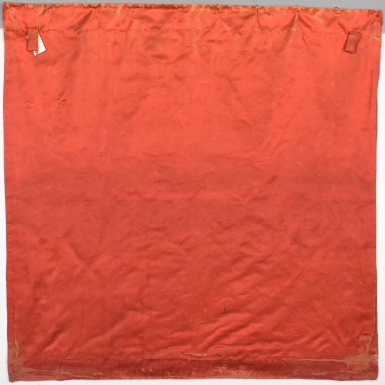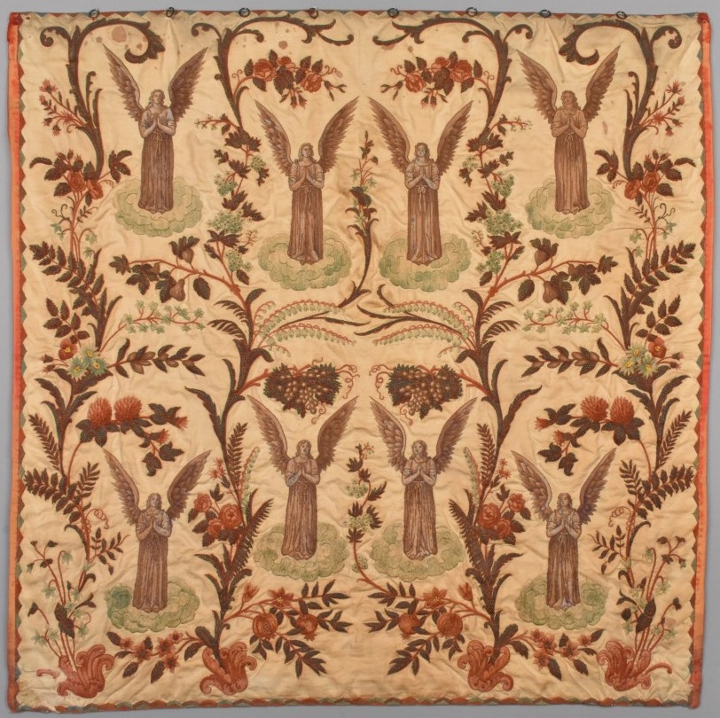 Voorhang tabernakel, aan één zijde geborduurd met acht engelen omgeven door bloemmotieven, van ds. Leendert Schouten