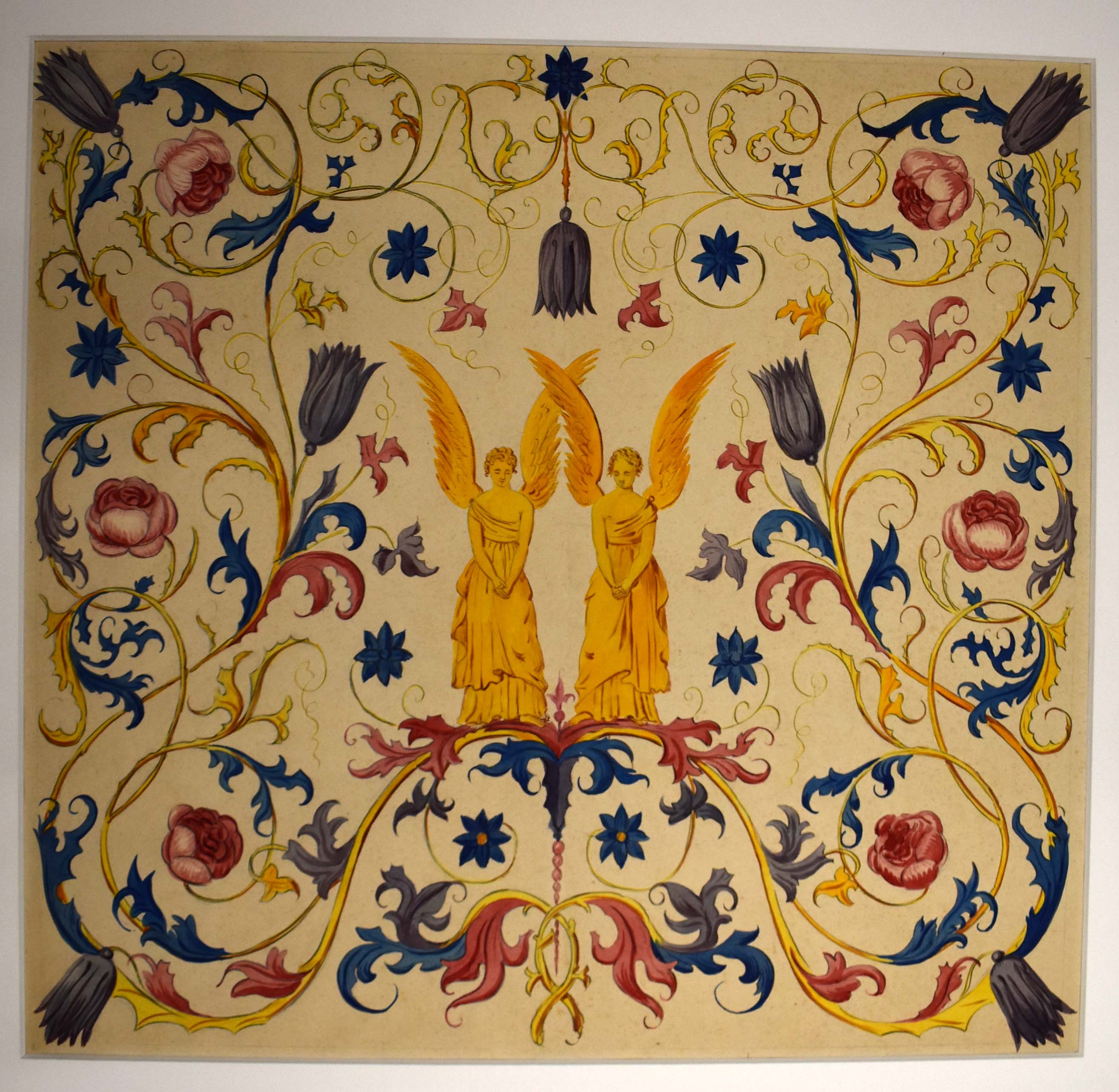 Ontwerptekening voor de voorzijde van het voorhang van het Heilige der Heiligen van de tabernakel met twee engelen, omgeven door rode en paarse bloemmotieven
