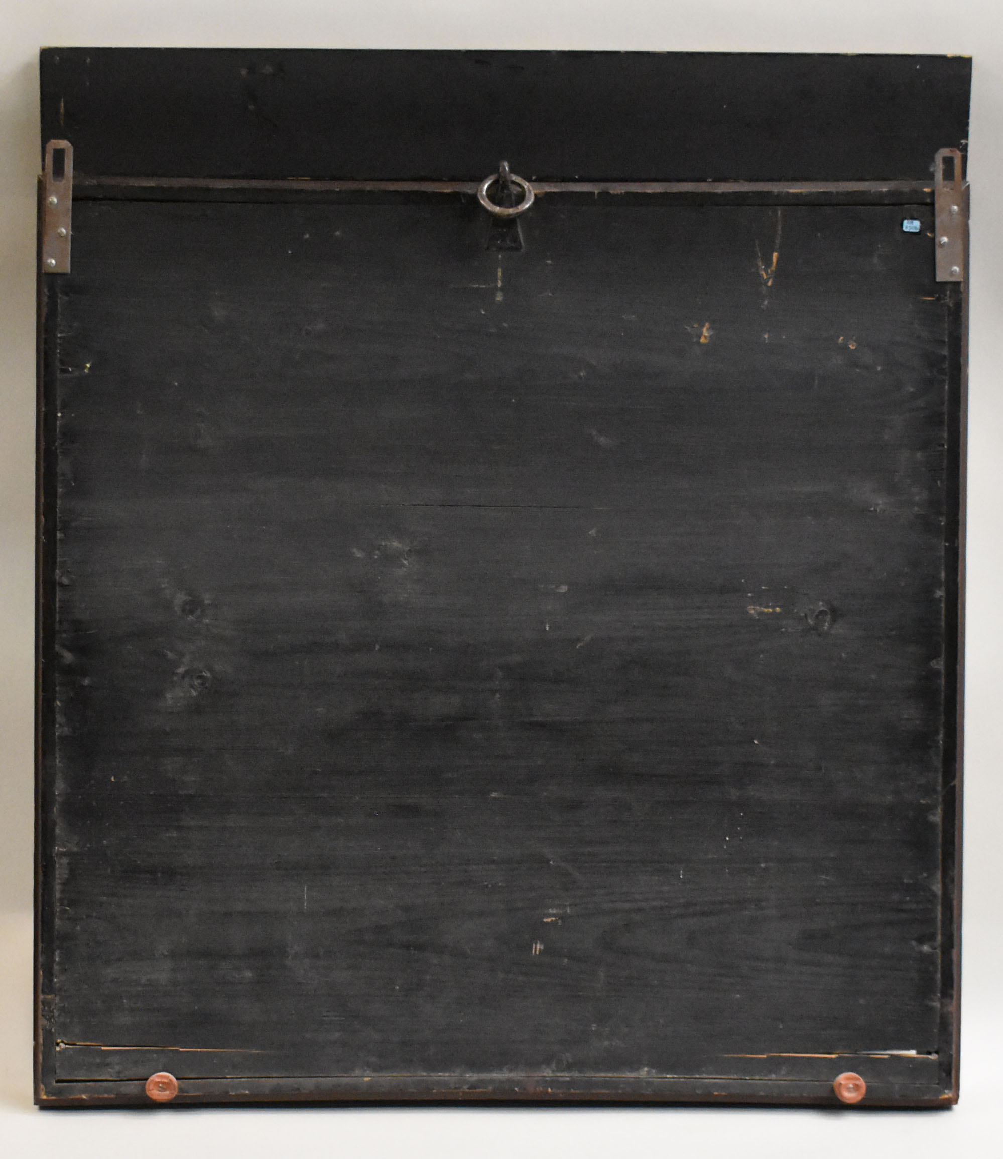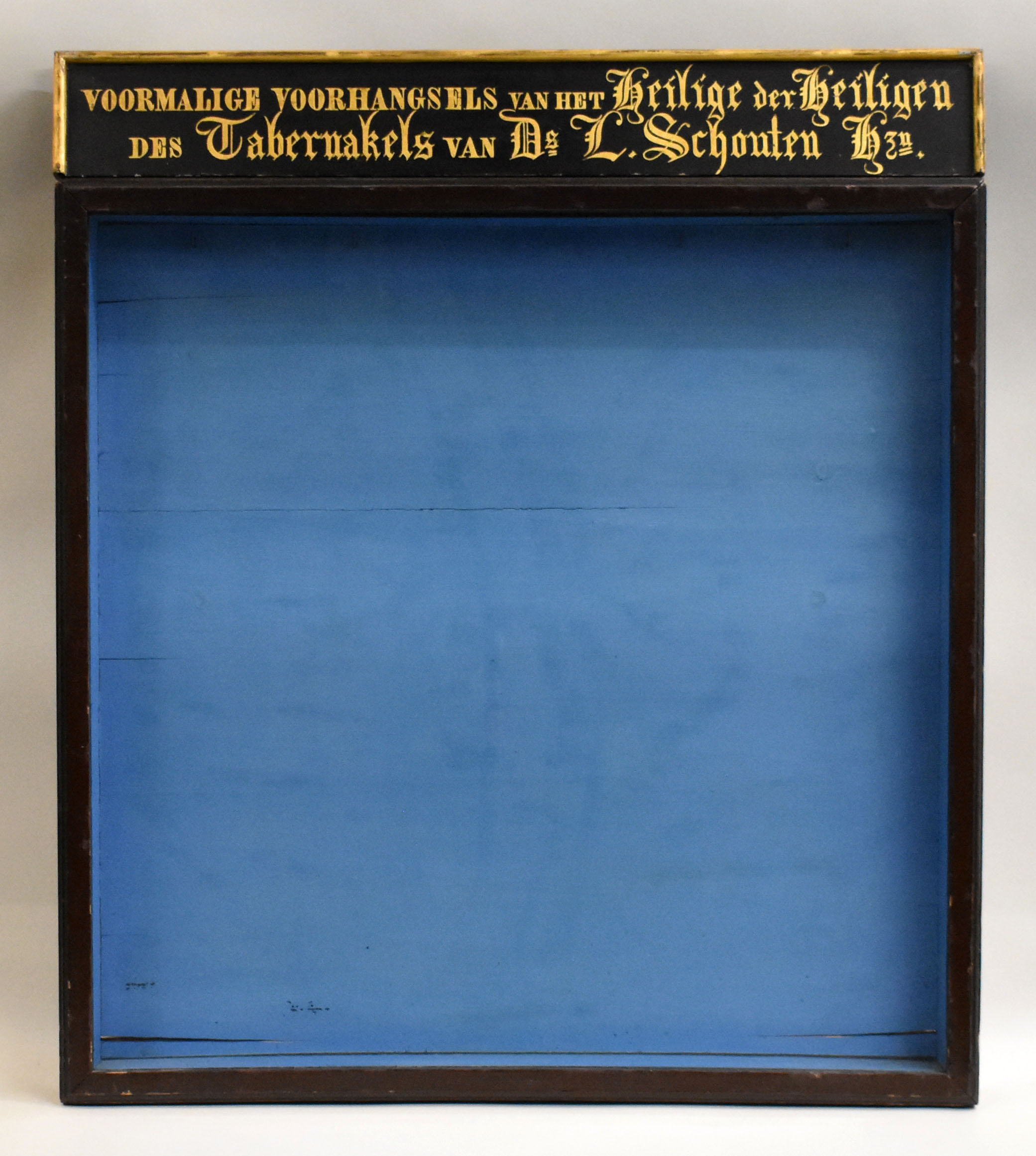 Vitrinekast voor RMCC BM 850 met tekstbord waarop "Voormalige voorhangsels van het Heilige der Heiligen des tabernakels van Ds. L. Schouten Hzn."
