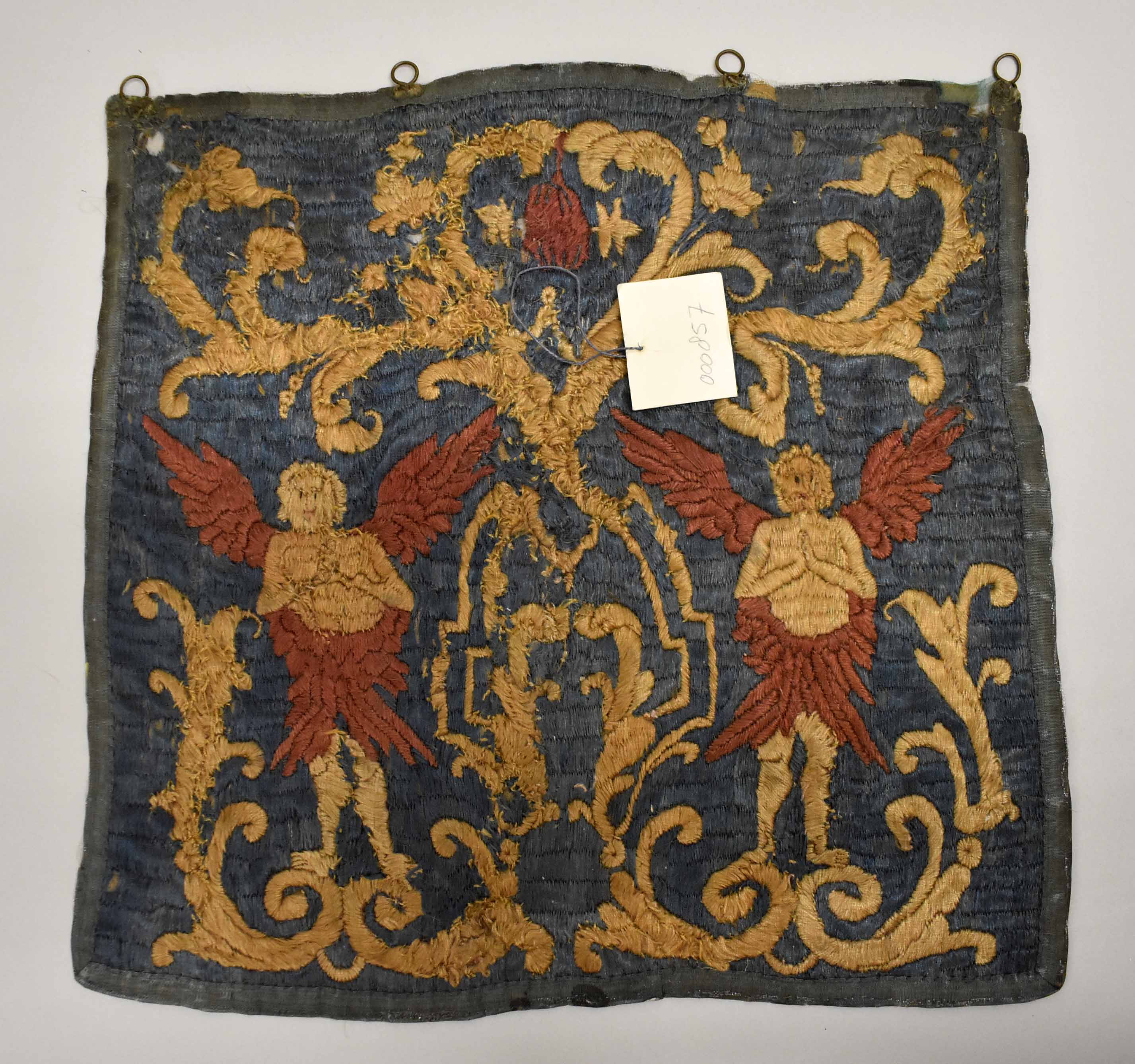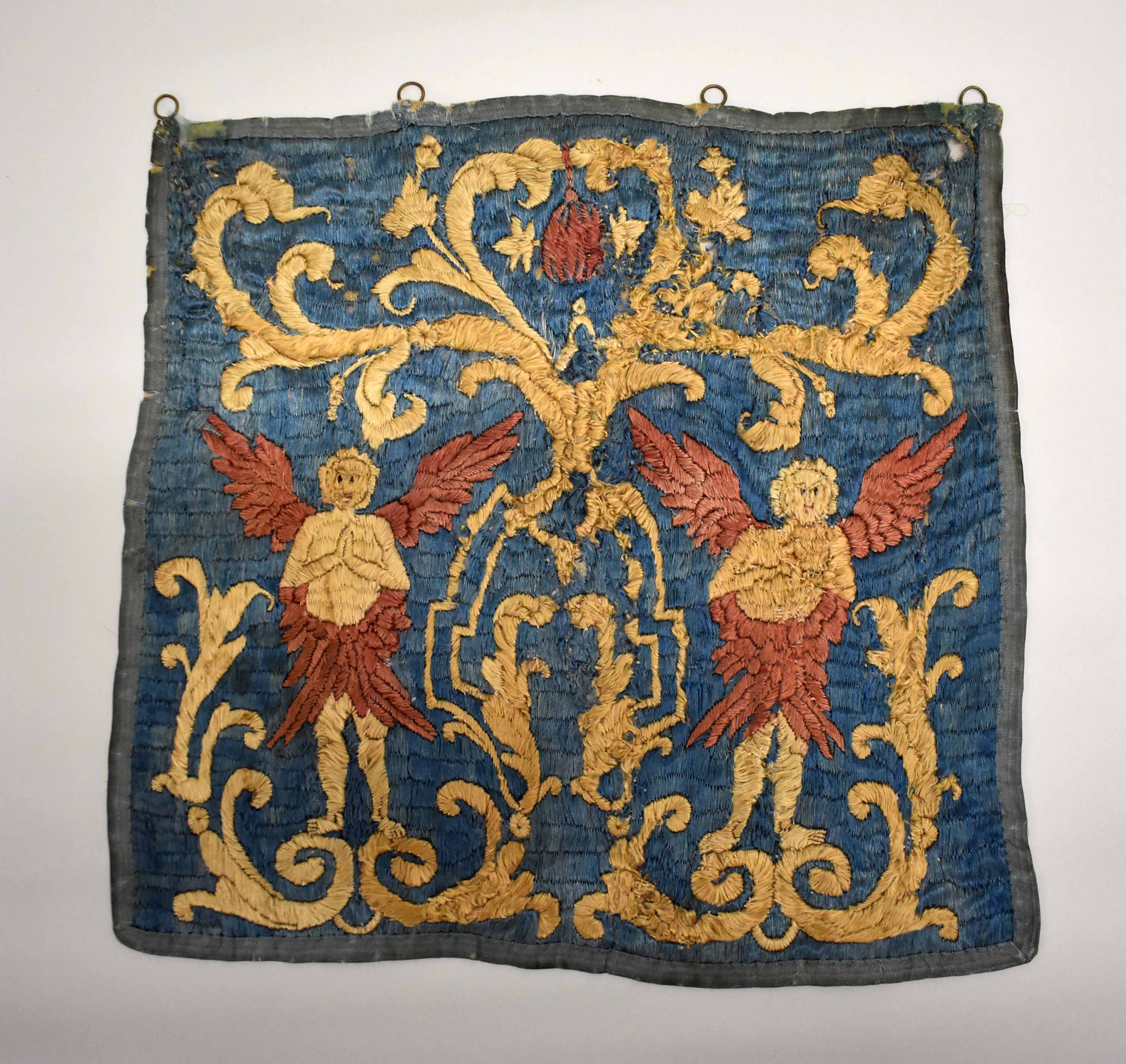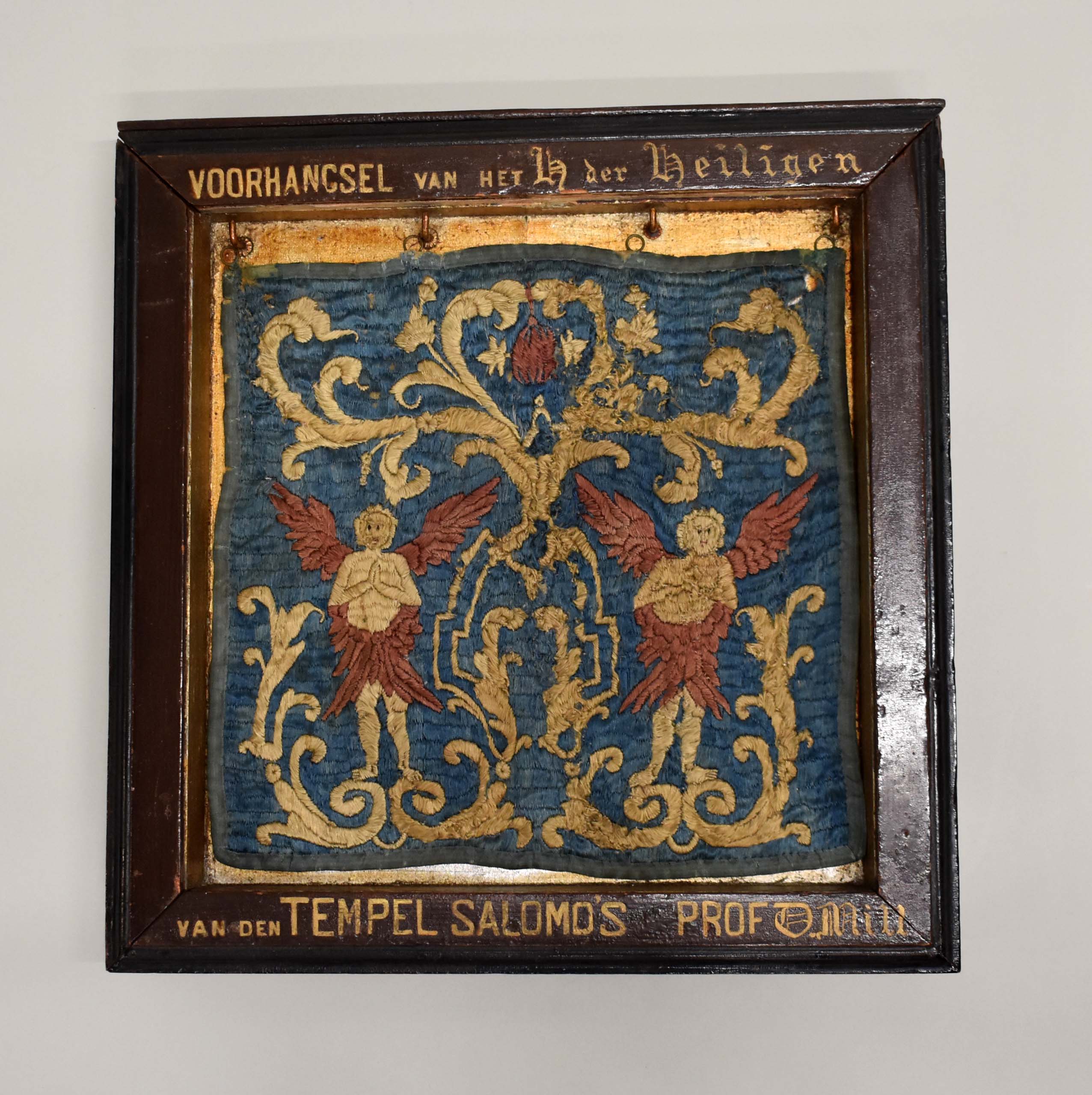 Voorhang van het Heilige der Heiligen van de tempel van Salomo, dubbelzijdig geweven, geborduurd met twee engelen omringd door bloemmotieven op blauwe ondergrond, van prof. David Mill