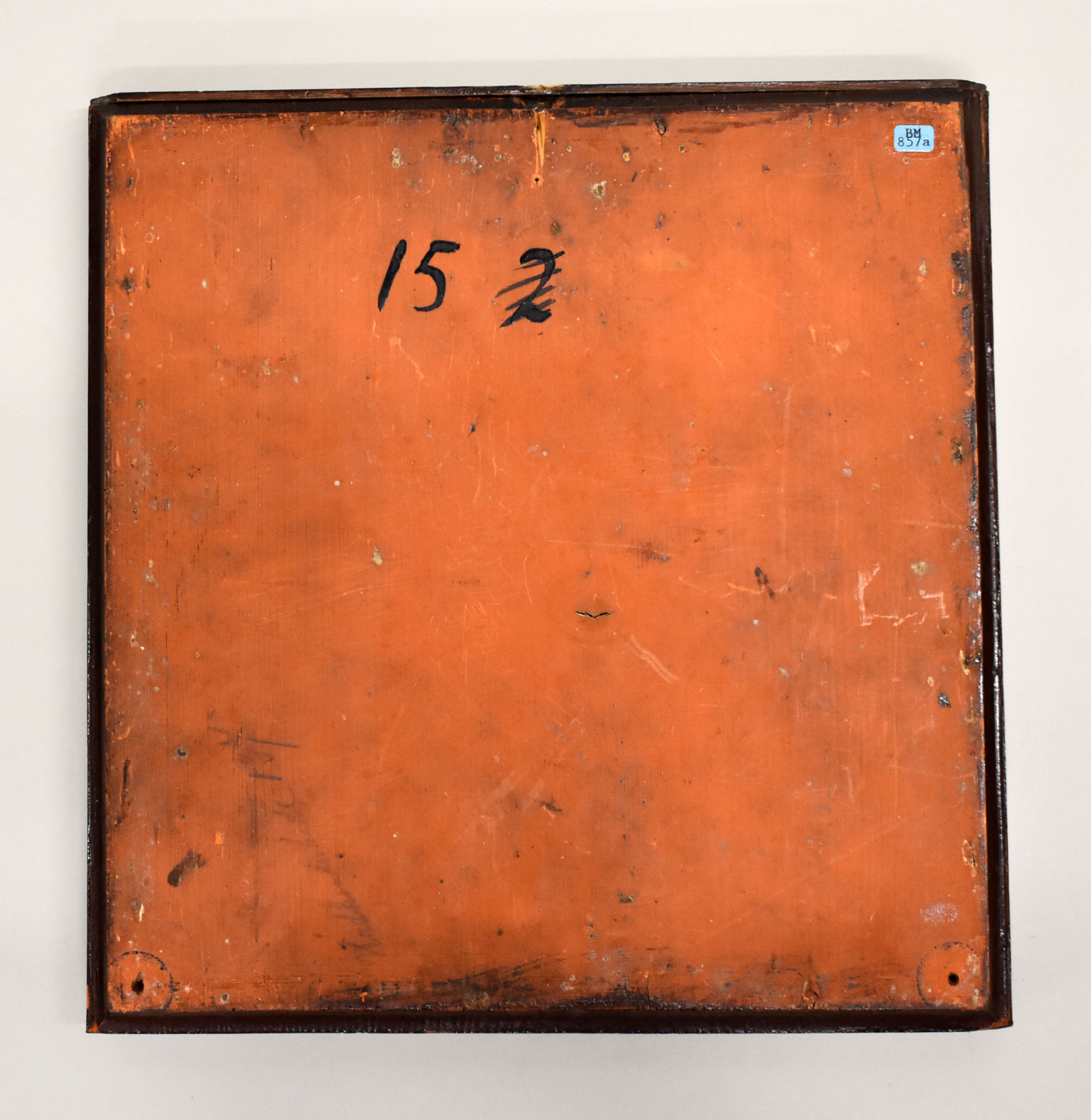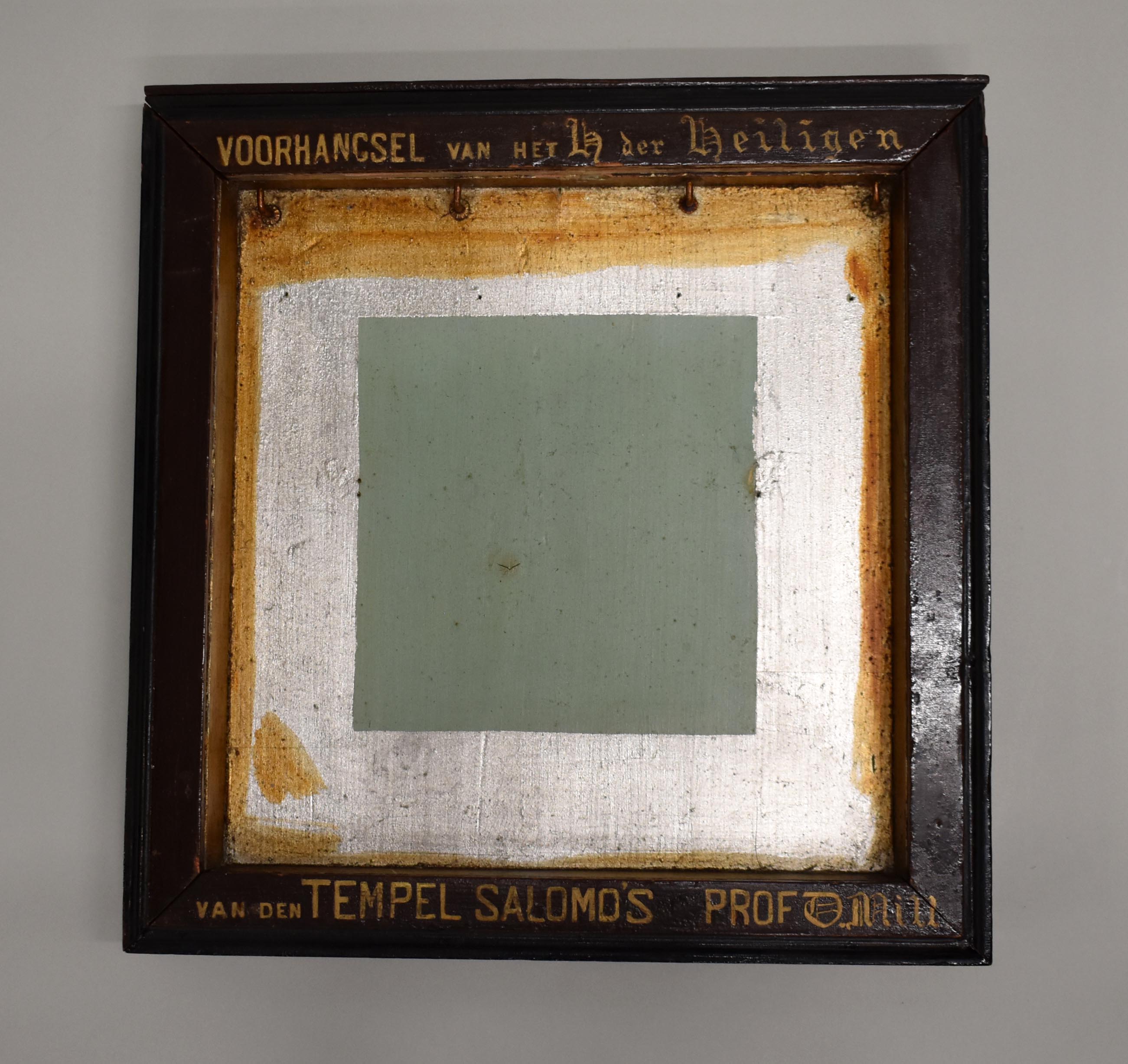 Vitrinekastje voor RMCC BM 857 met "Voorhangsel van het H. der Heiligen van den tempel Salomo's prof. D. Mill"