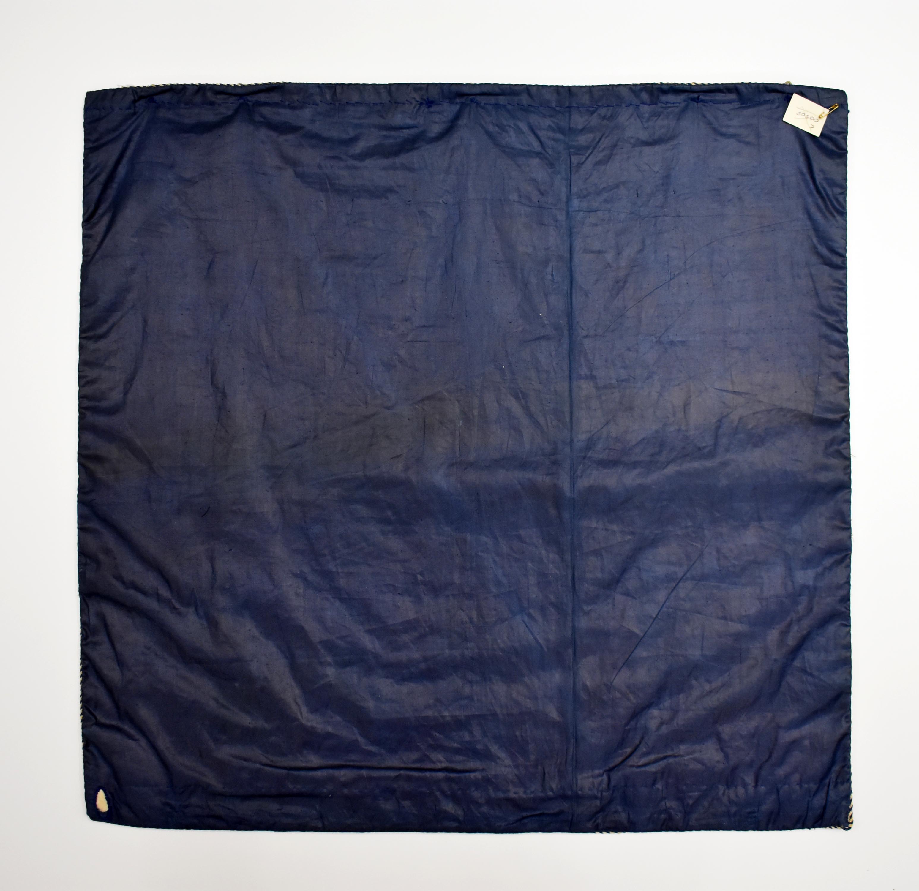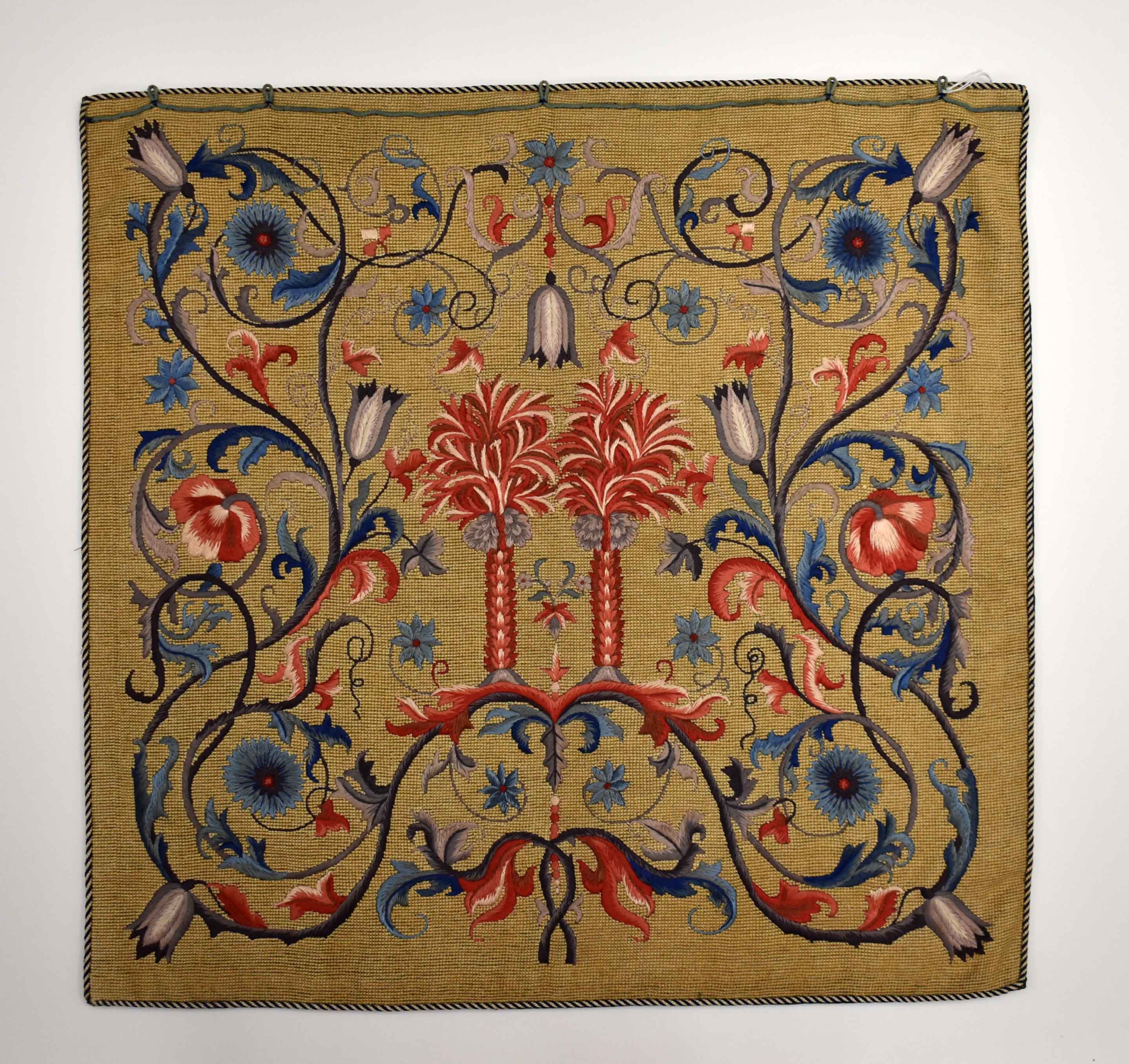 Voorhang van het Heilige van de tabernakel, éénzijdig geborduurd met twee bomen omgeven door bloemmotieven, randen afgezet met blauw-wit koord, aan bovenzijde groen koord met vijf lussen, van ds. Leendert Schouten