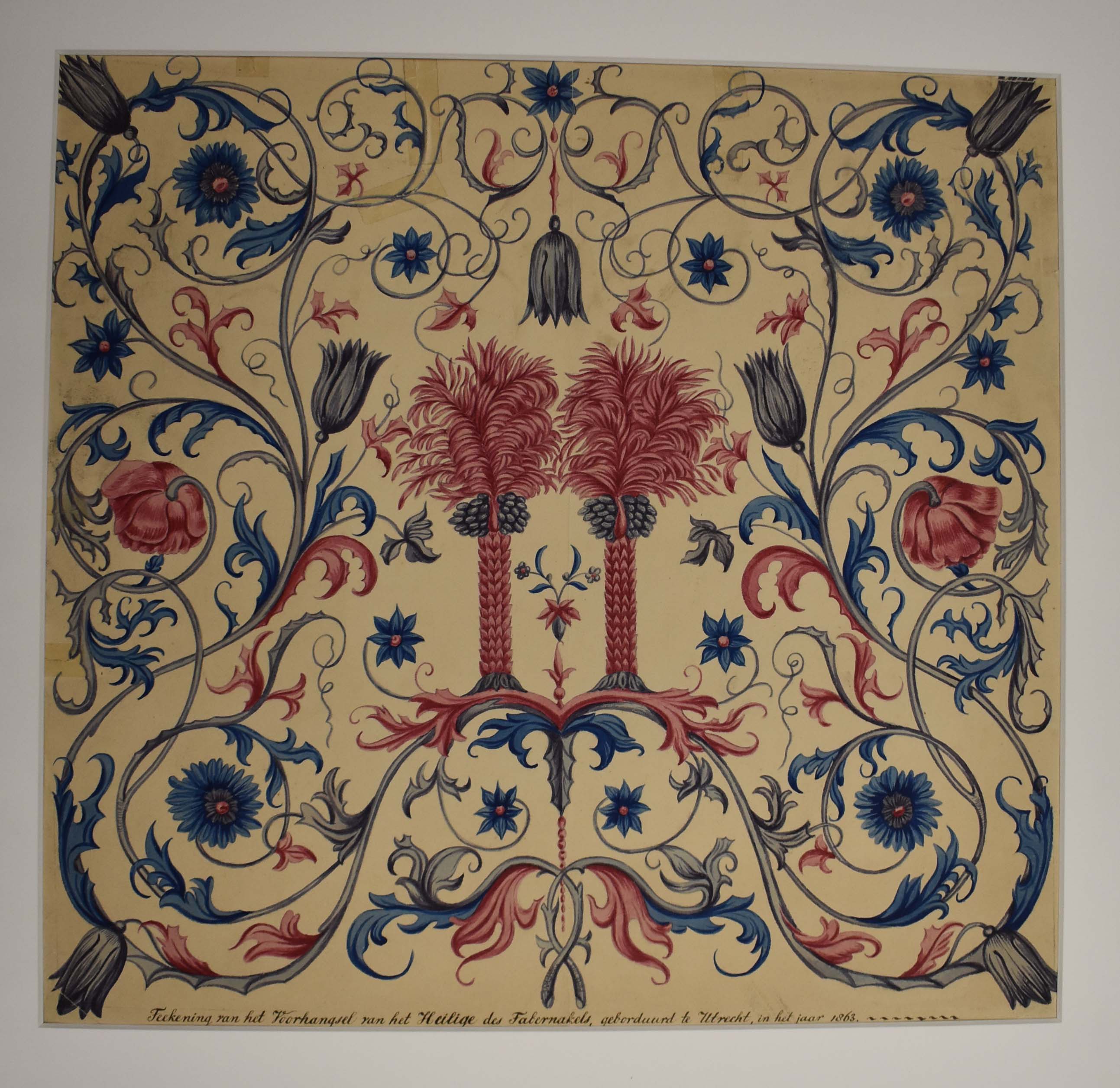 Ontwerp (werktekening?) van de voorhang van het Heilige van de tabernakel, éénzijdig geborduurd met twee bomen omgeven door bloemmotieven