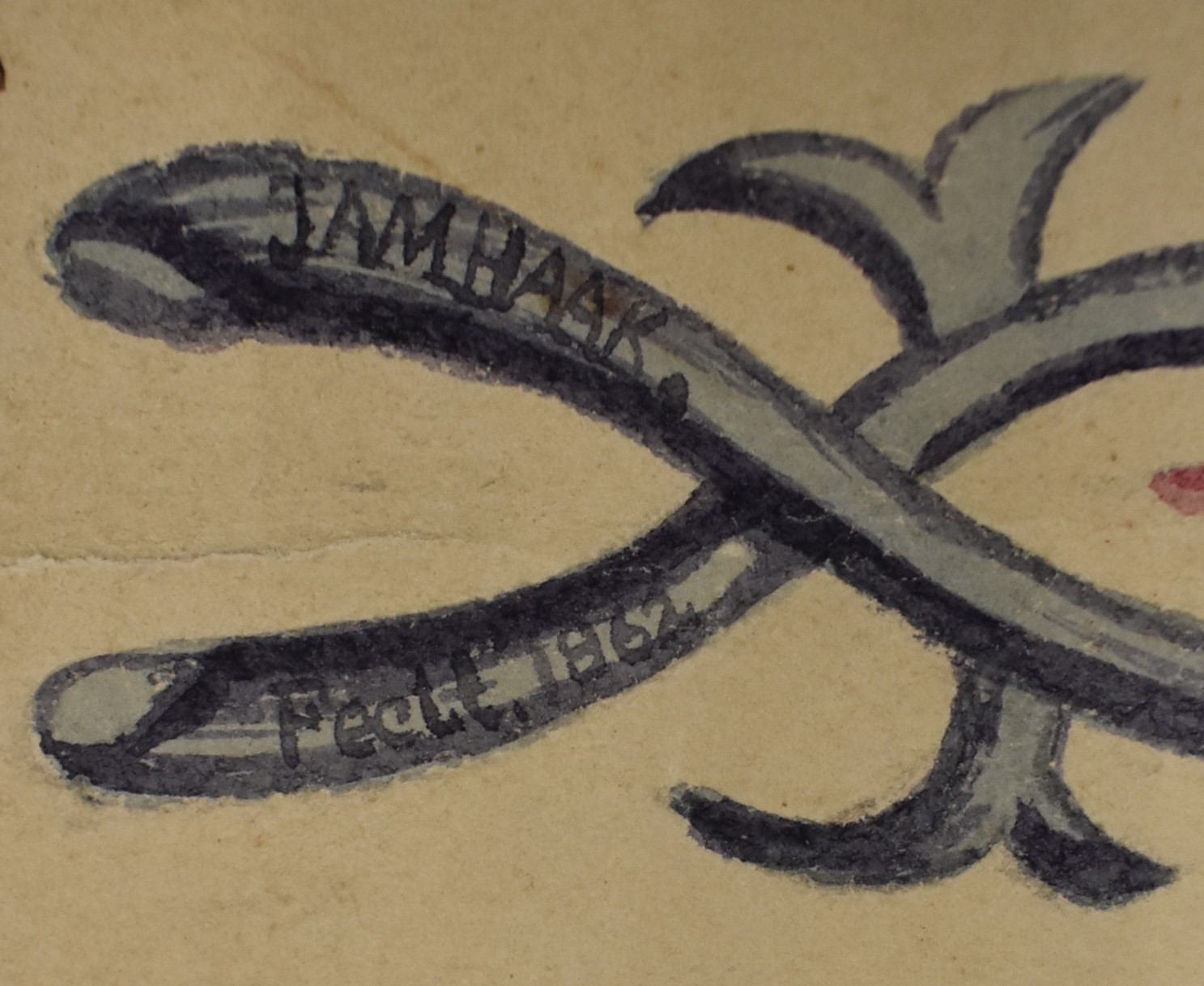 Ontwerp (werktekening?) van de voorhang van het Heilige van de tabernakel, éénzijdig geborduurd met twee bomen omgeven door bloemmotieven, randen afgezet met blauwwit koord, aan bovenzijde groen koord met vijf lussen, van ds. Leendert Schouten. Middenonder gedateerd en gesigneerd: JAM Haak fecit 1862. Het betreft hier mogelijk Johannes Andries Martinus Haak. Onder de tekening het ...