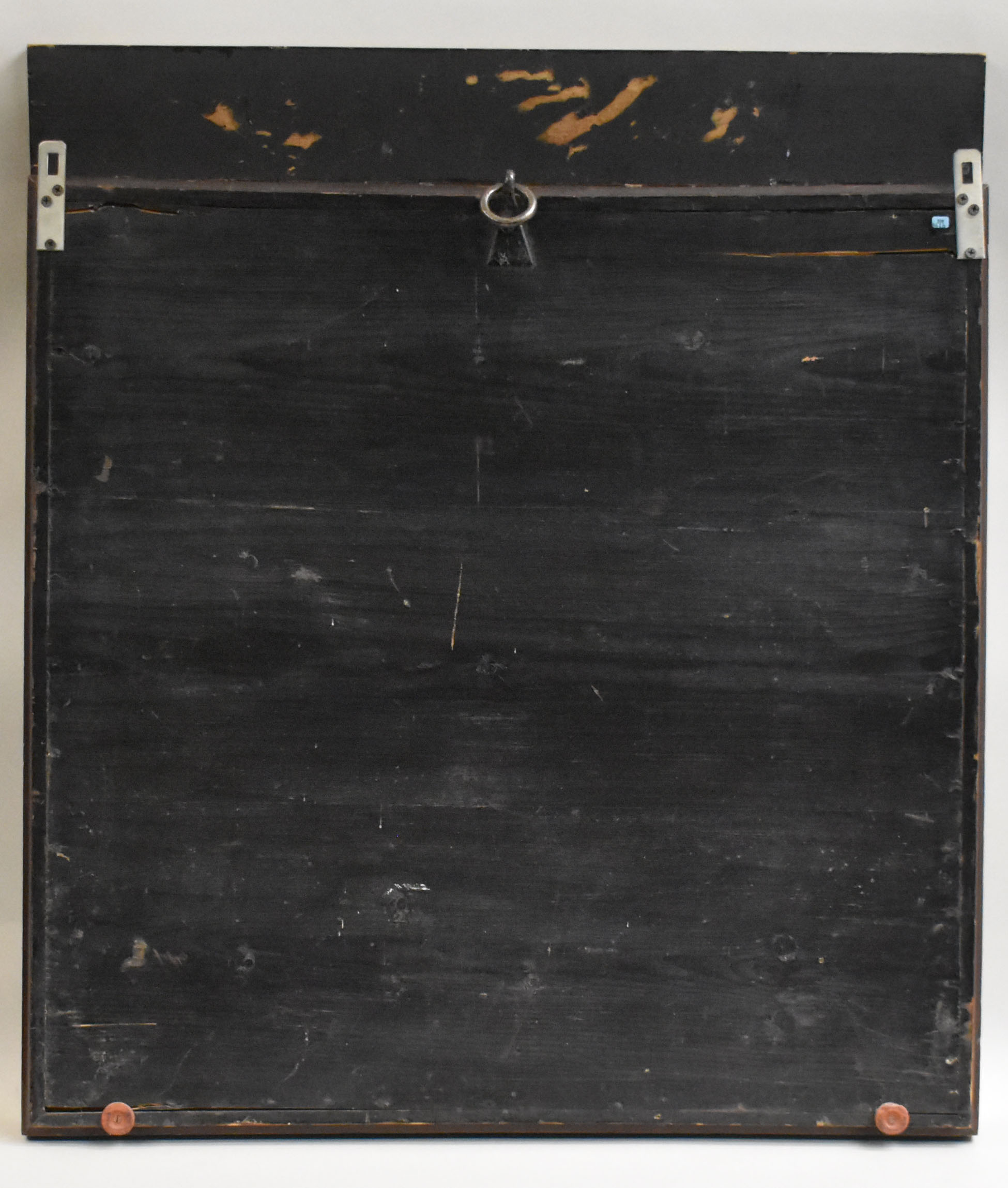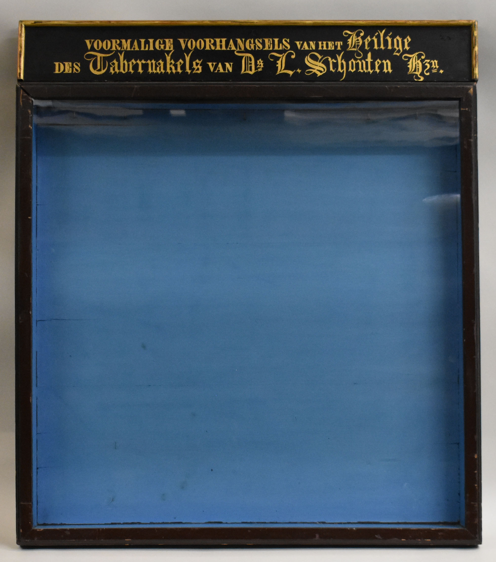 Vitrinekast voor RMCC BM 861 met tekstbord waarop "Voormalige voorhangsels van het Heilige des tabernakels van Ds. L. Schouten Hzn."