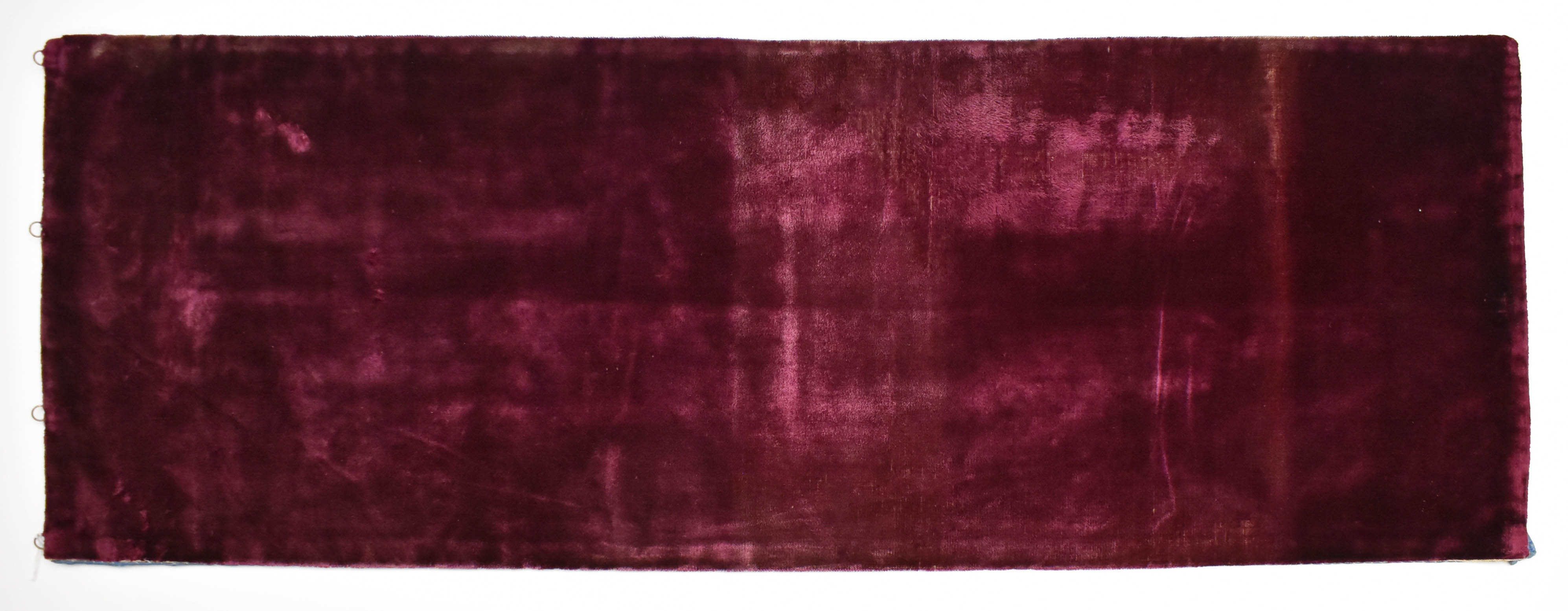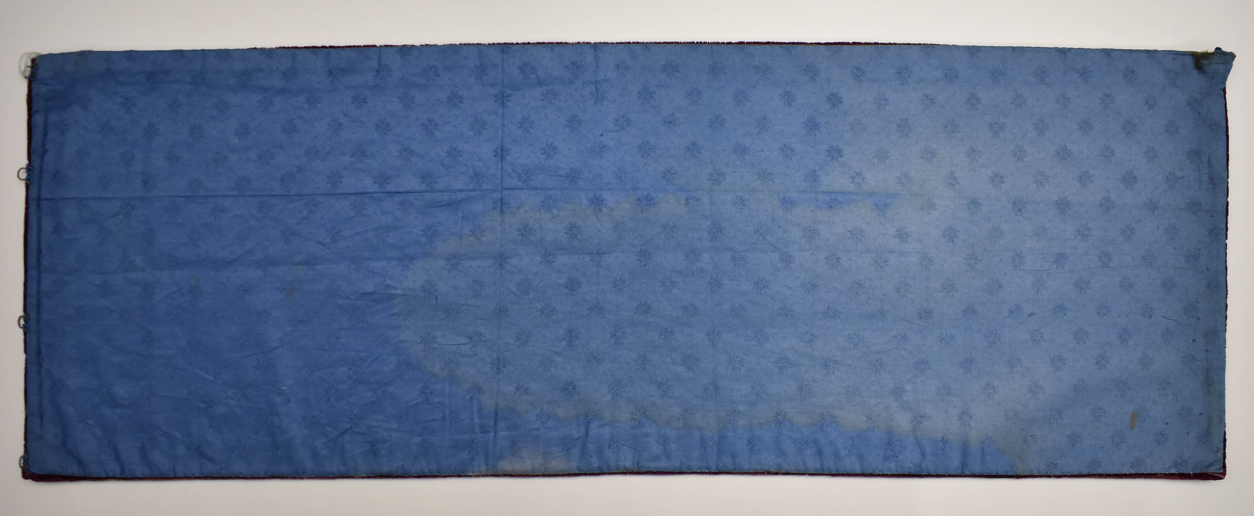 Geborduurde voorhang van een onbekende tabernakel, van rood zijdefluweel, achterzijde van blauwe stof met bloemmotief