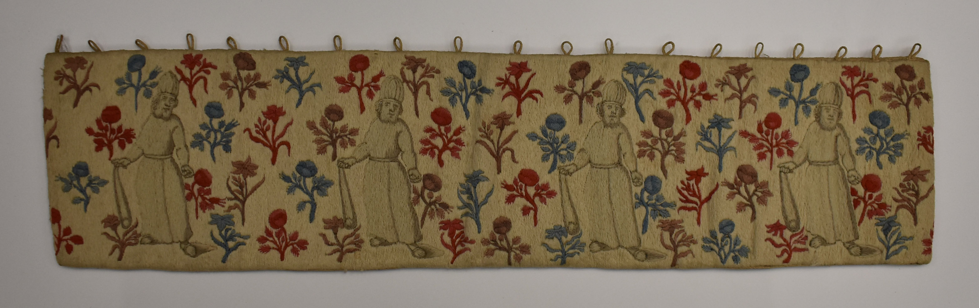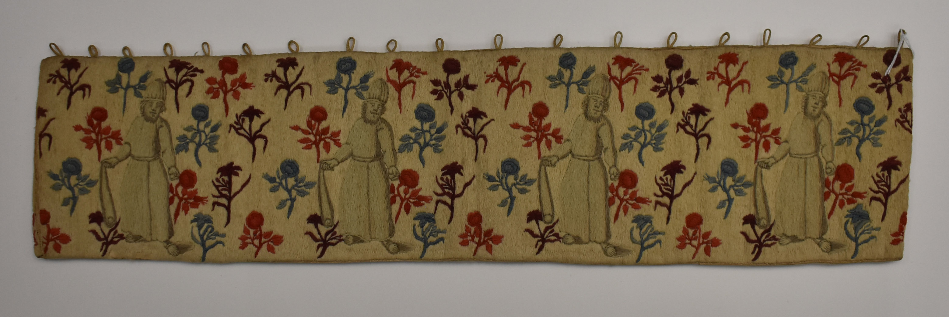 Voorhang van de voorhof, dubbelzijdig geborduurd met vier maal koning David met slinger, omgeven door bloemmotieven, van de tabernakel van prof. B.S. Cremer