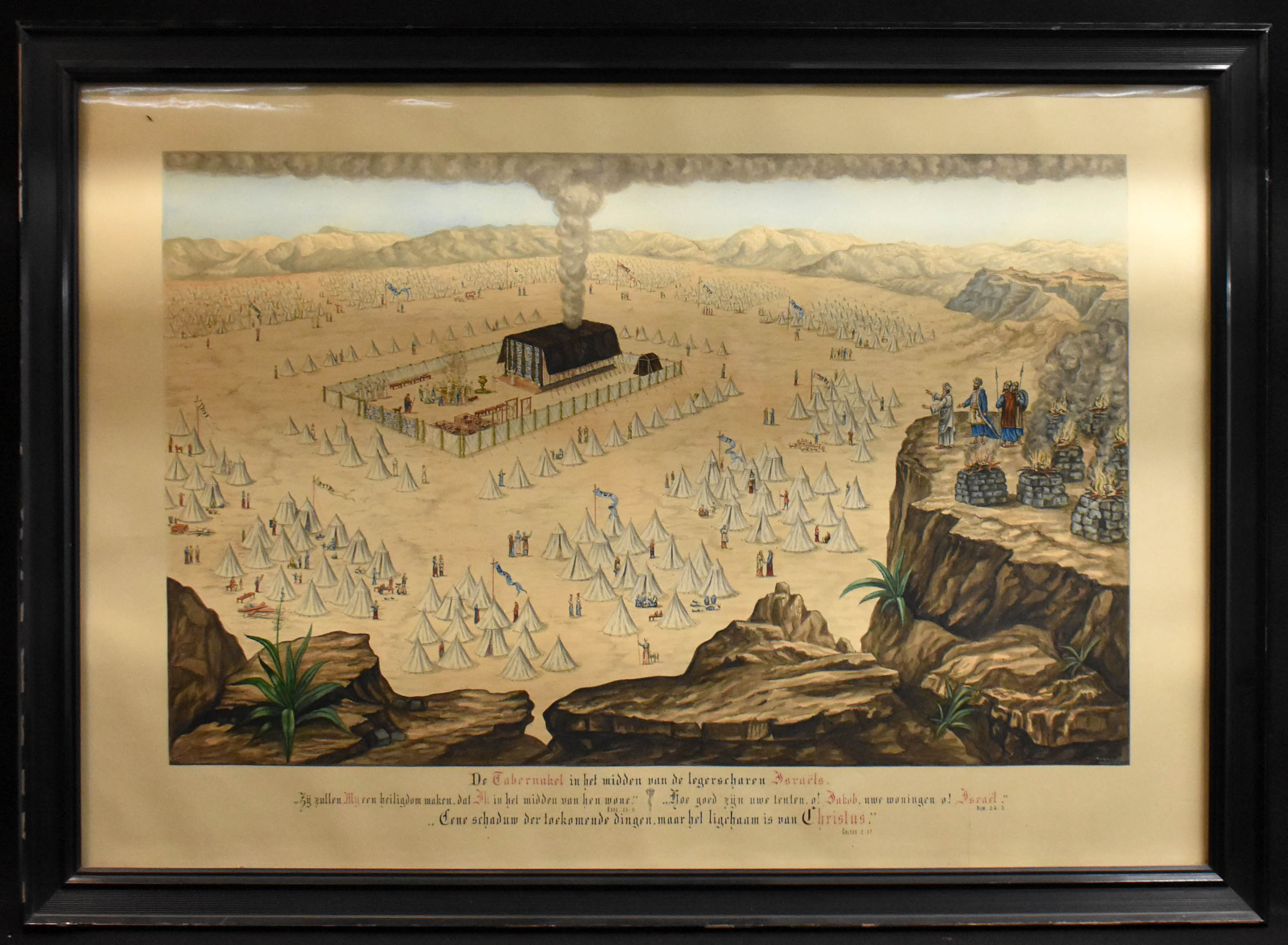 De Tabernakel in het midden van de Legerscharen Israëls, met "Zij zullen een heiligdom maken ...". Gesigneerd en gedateerd rechtsonder: W.J.L.ts v. Bueren / 1 maart 1884