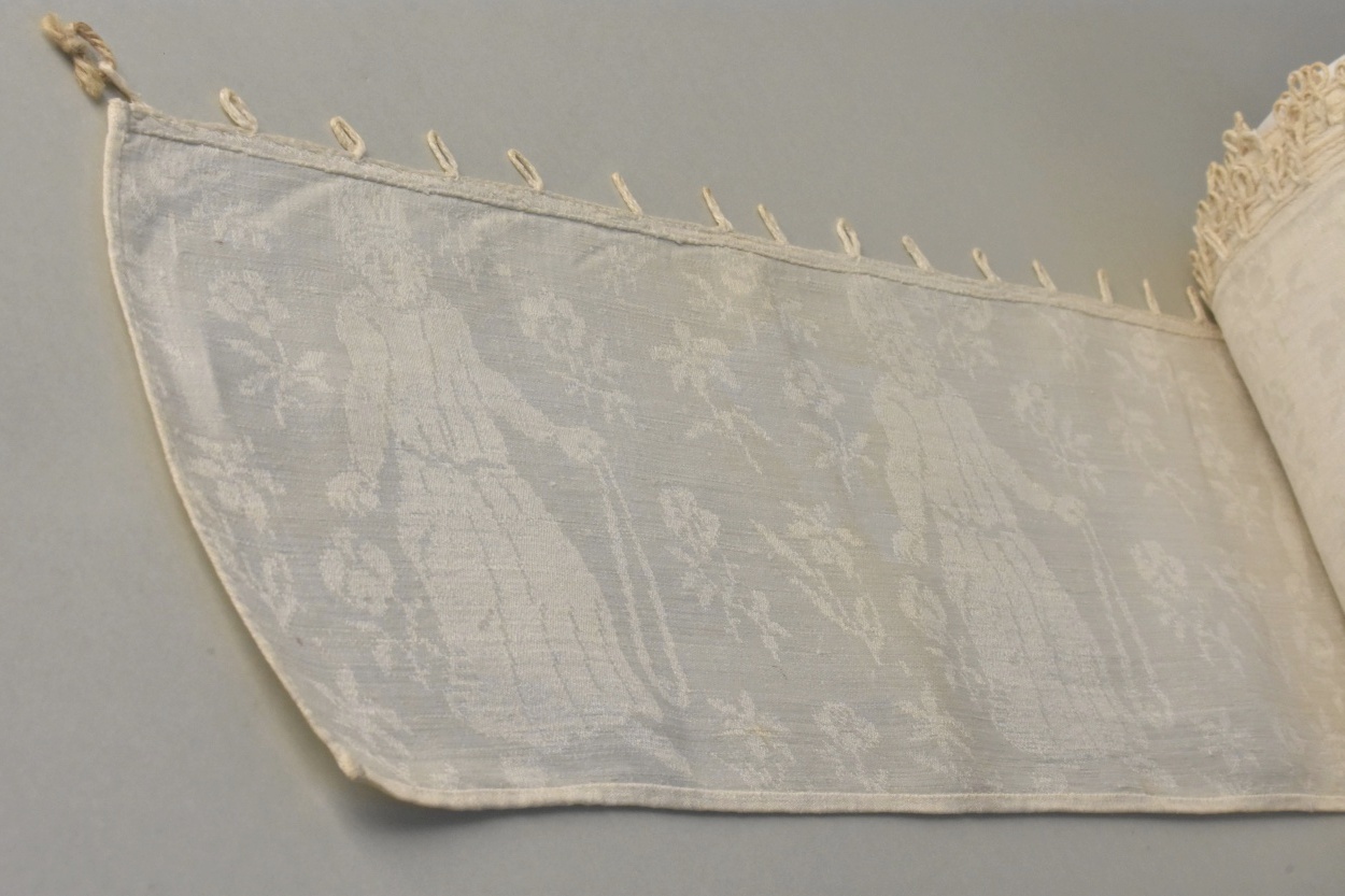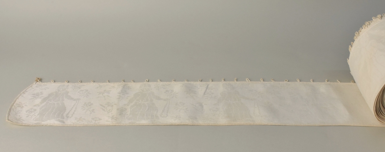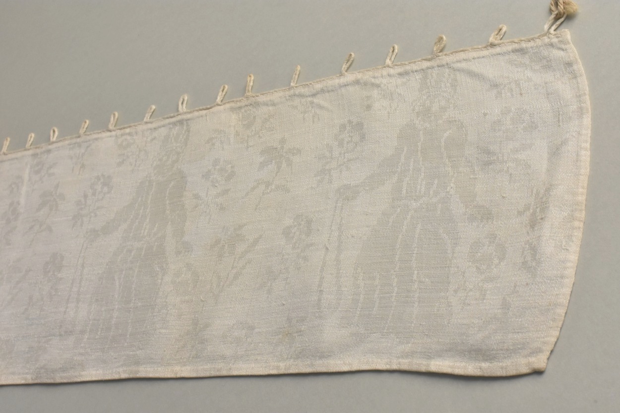 Linnendamast met herhaald ingeweven figuren (David met slinger) en florale motieven, van omheining van de tabernakel van prof. B.S. Cremer