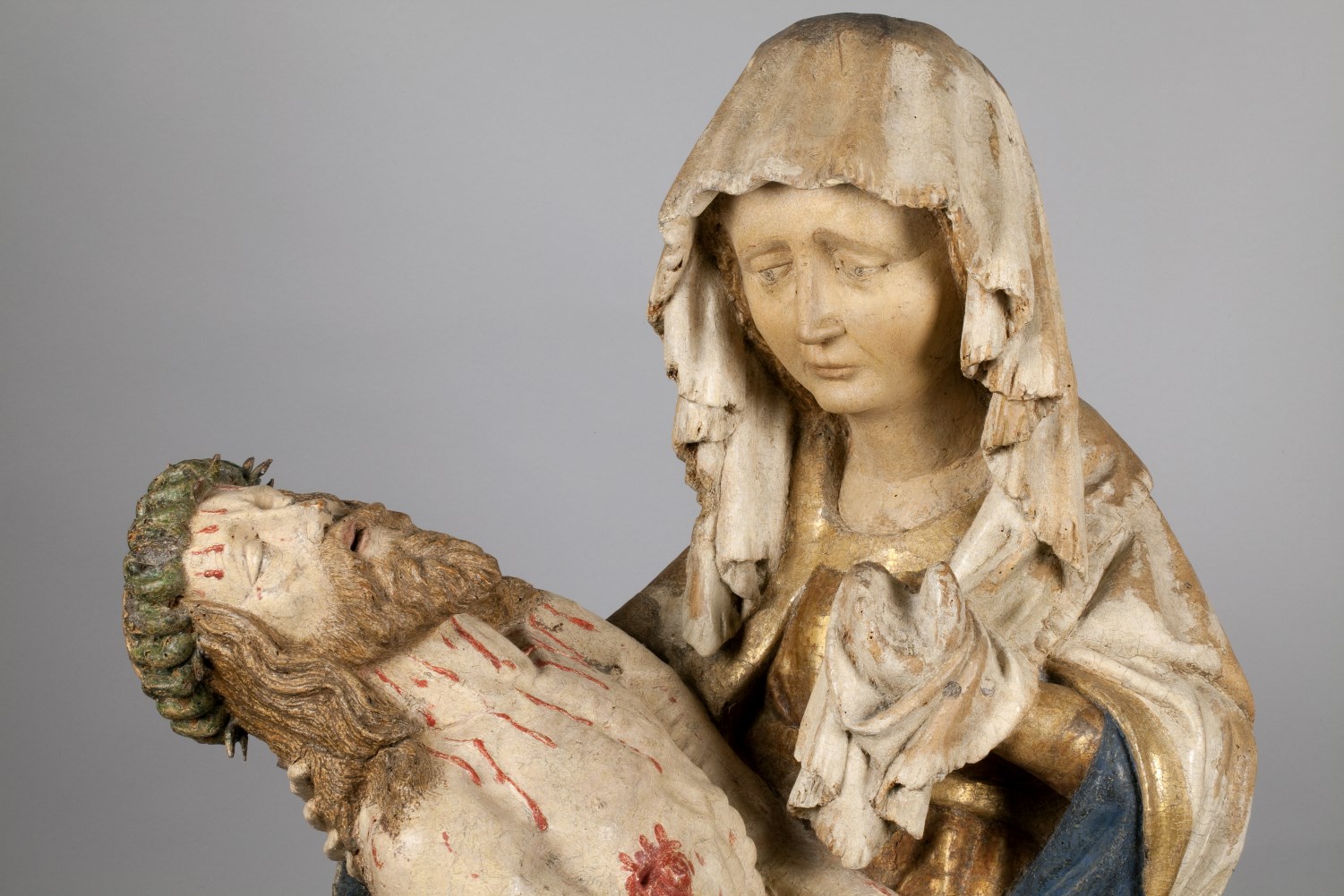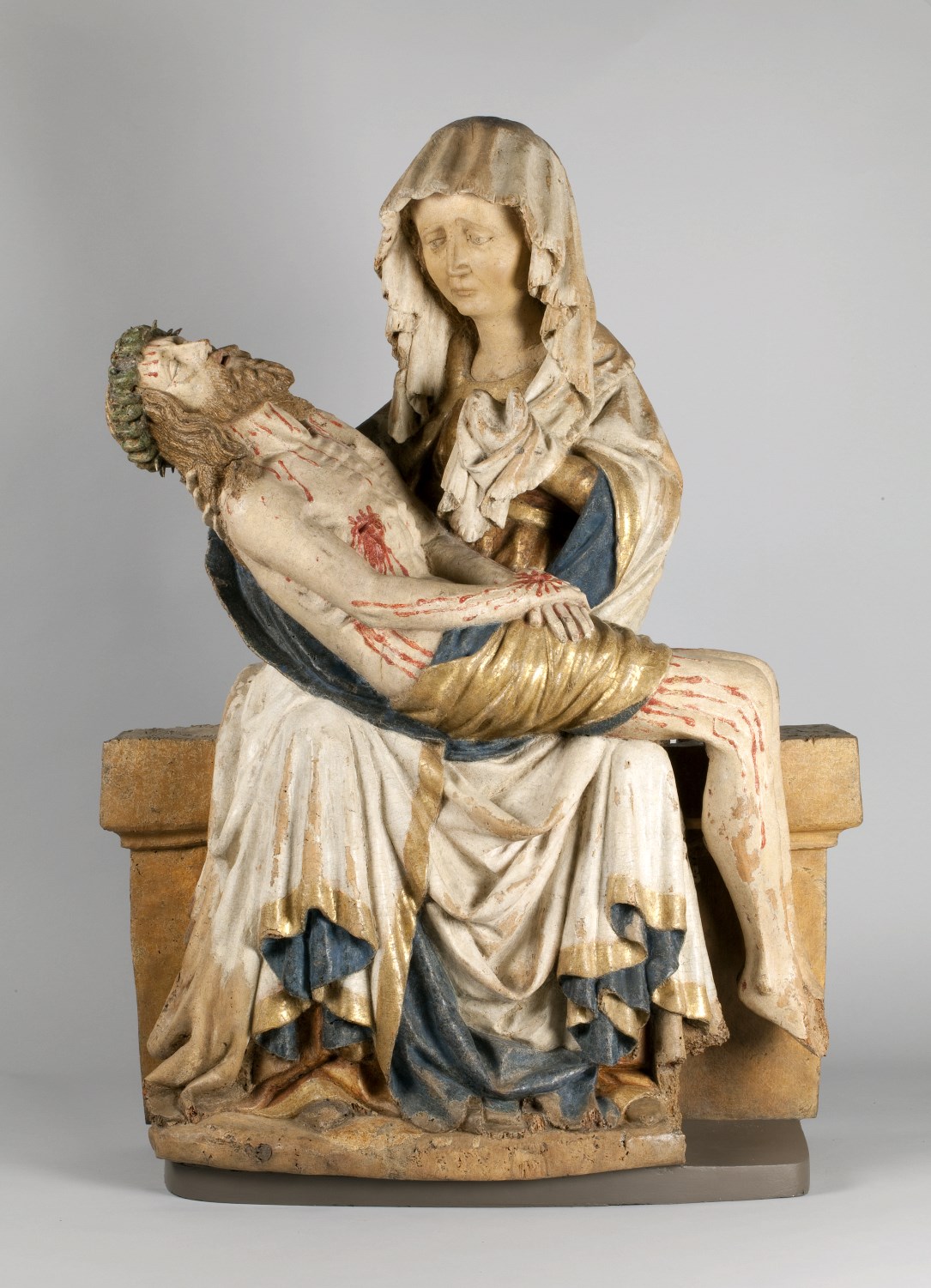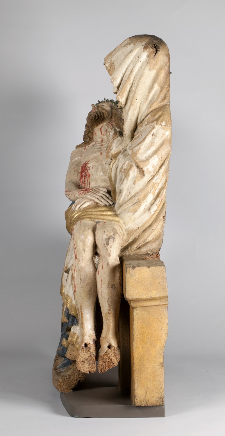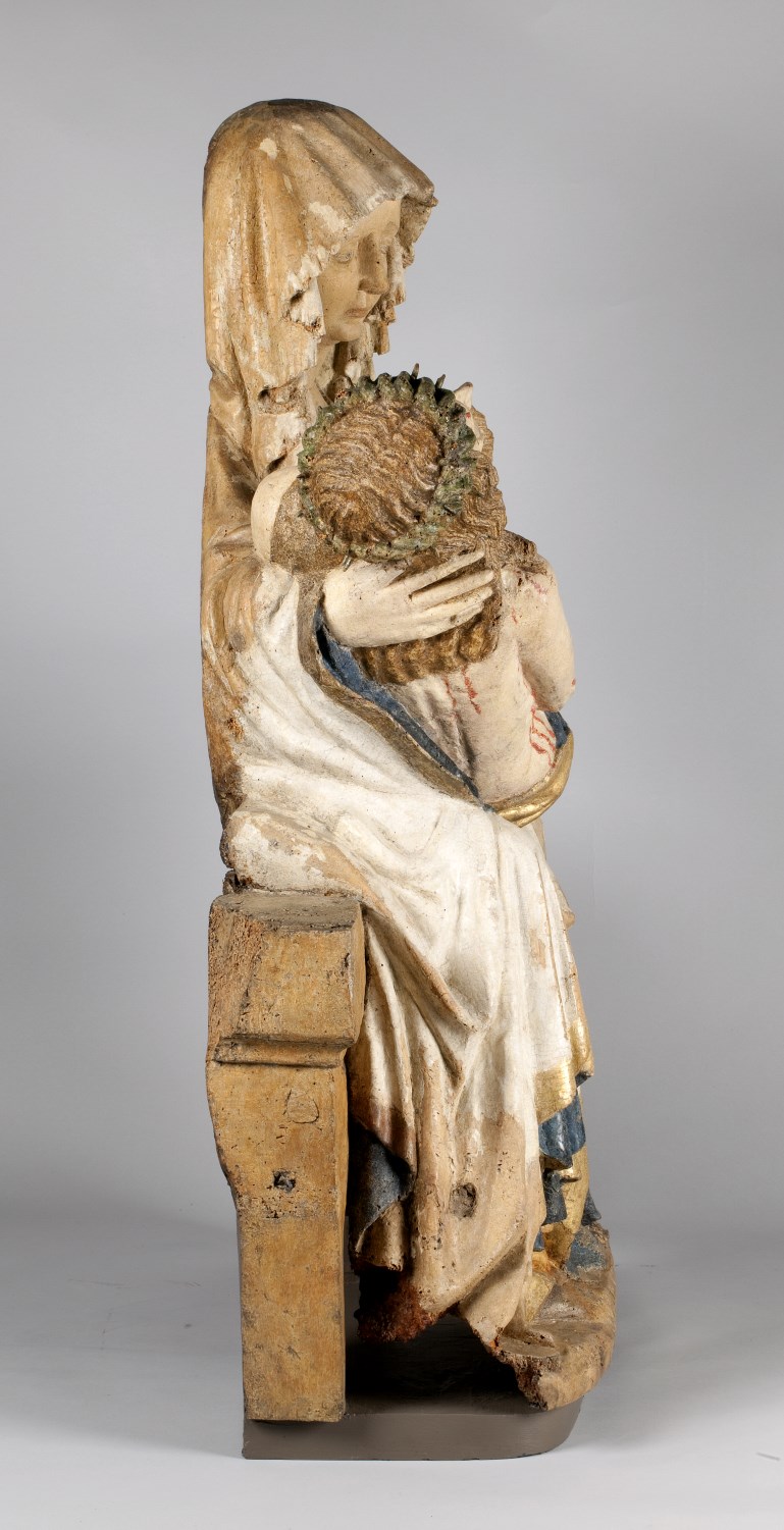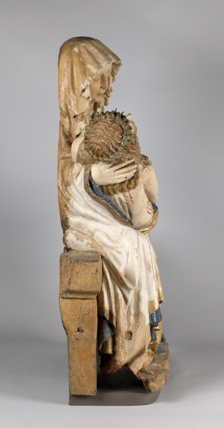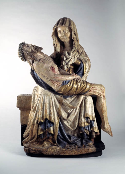 Maria zit op een bank en draagt de dode Christus, met het hoofd naar links, op haar schoot. Zijn handen rusten gevouwen op zijn bovenbenen. Hij heeft een gapende wond in zijn rechterzijde. Over zijn lichaam lopen dikke stralen bloed. Maria lijkt haar met haar sluier bedekte linkerhand naar haar gezicht te brengen. Met haar ...
