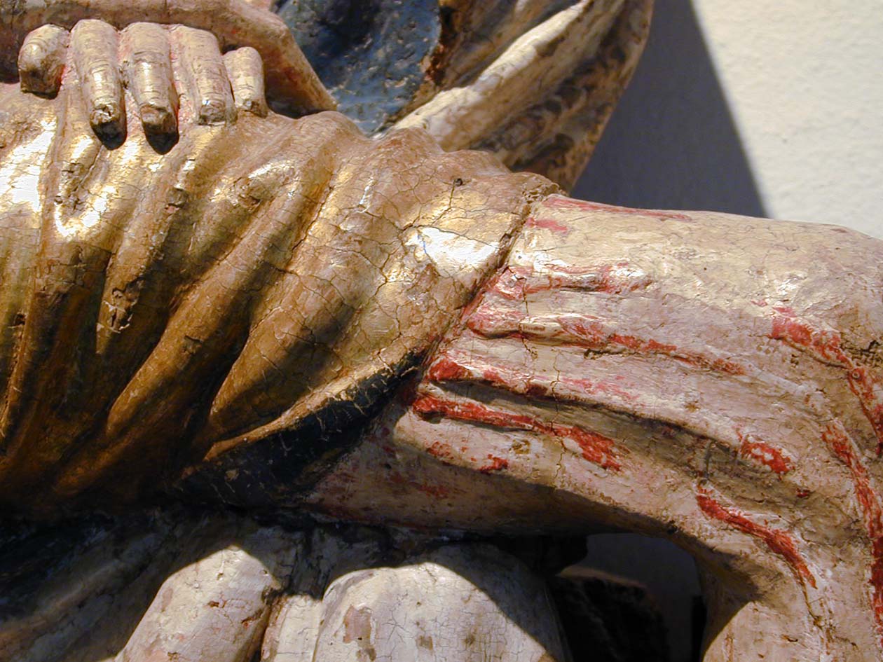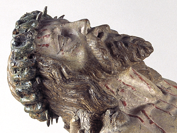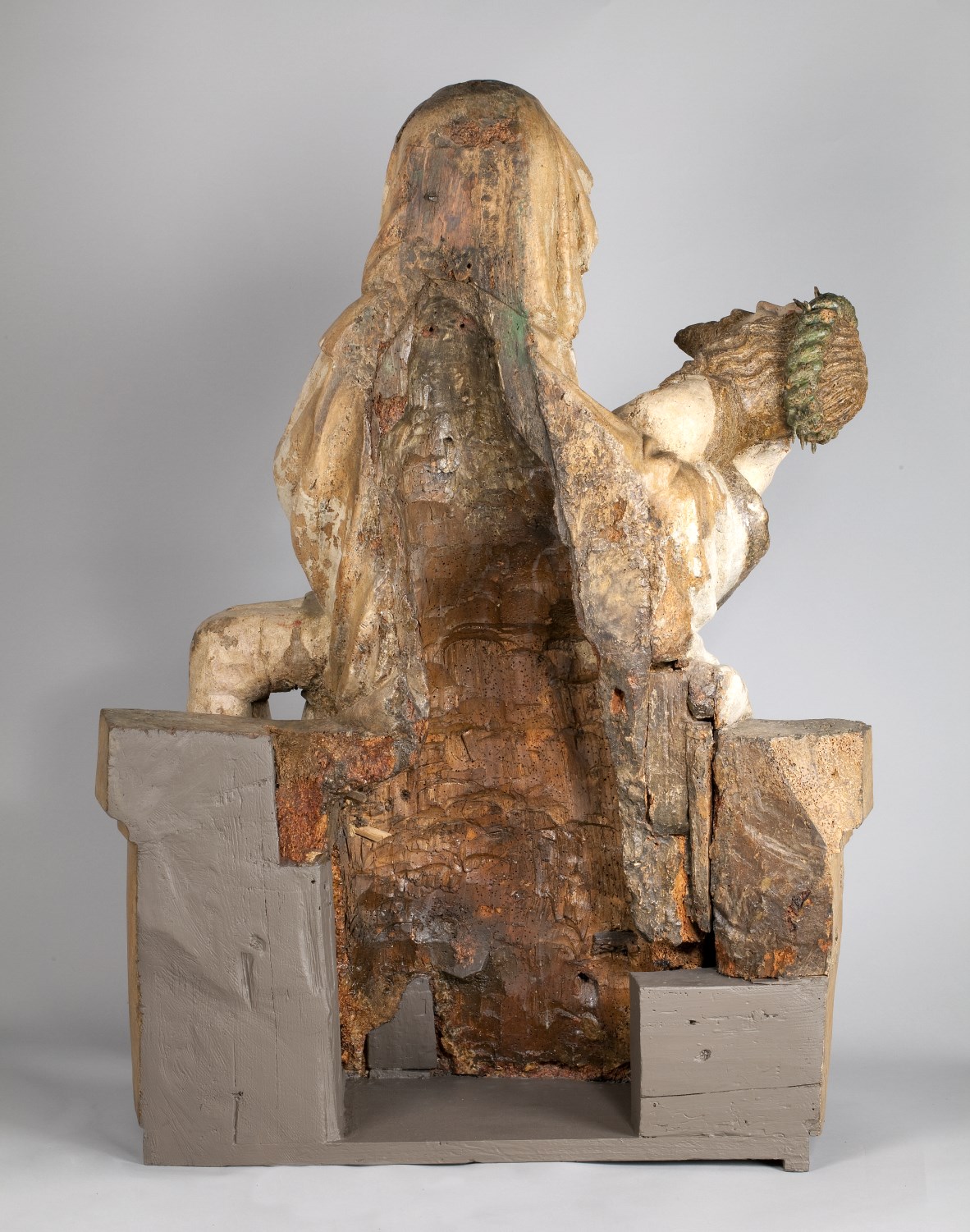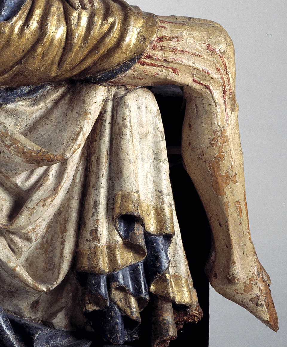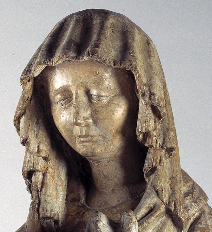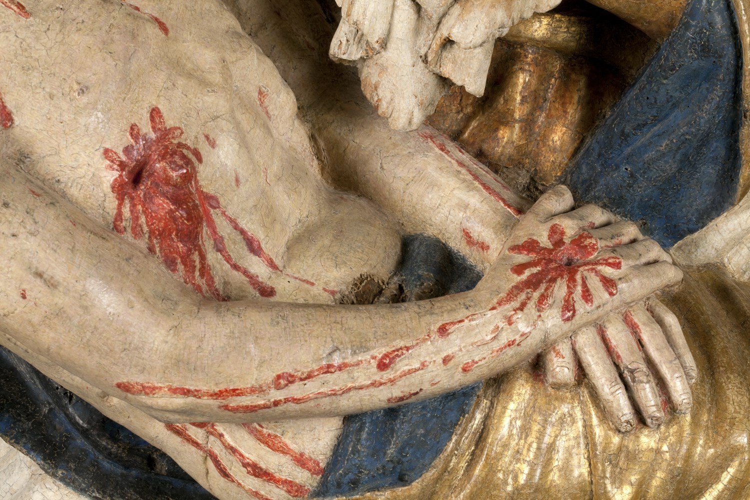 Maria zit op een bank en draagt de dode Christus, met het hoofd naar links, op haar schoot. Zijn handen rusten gevouwen op zijn bovenbenen. Hij heeft een gapende wond in zijn rechterzijde. Over zijn lichaam lopen dikke stralen bloed. Maria lijkt haar met haar sluier bedekte linkerhand naar haar gezicht te brengen. Met haar ...
