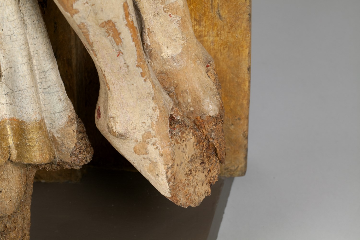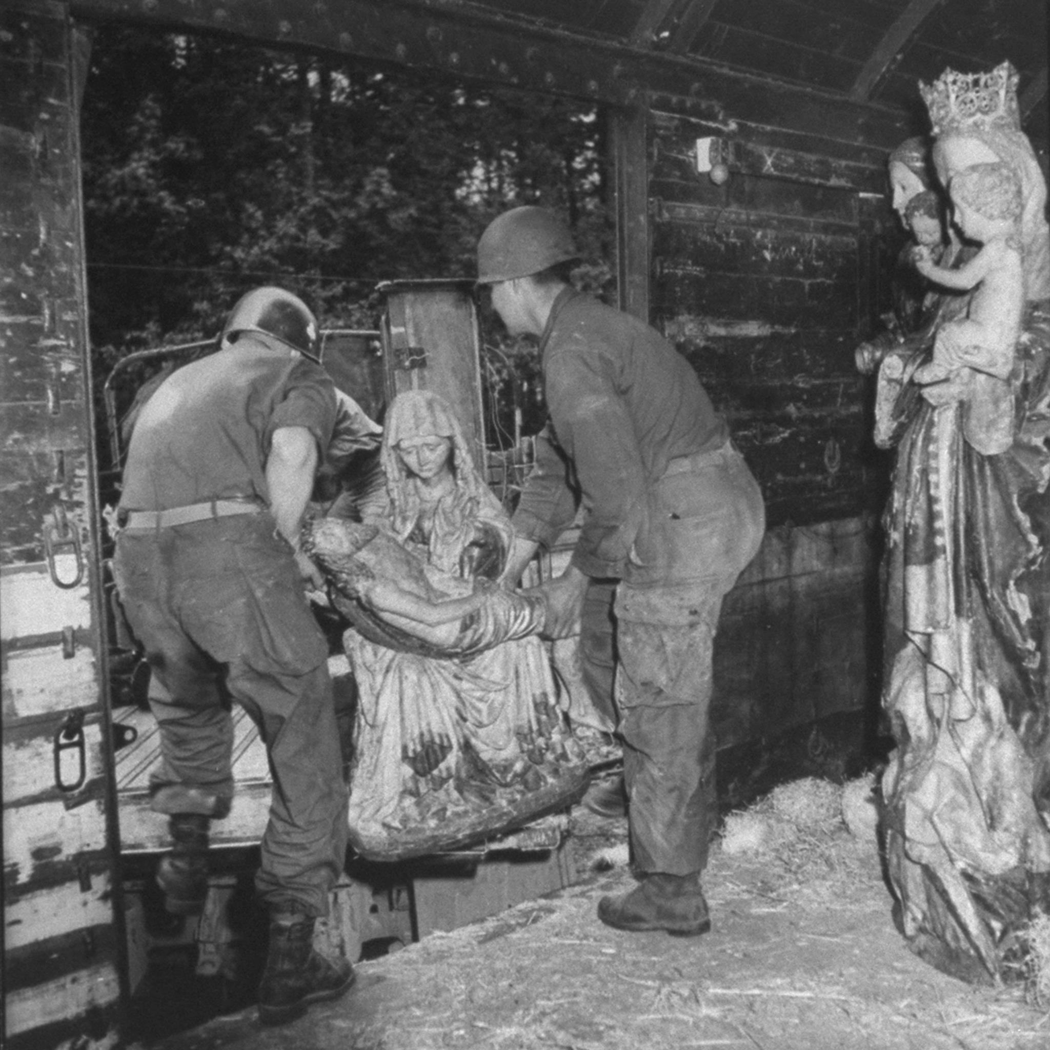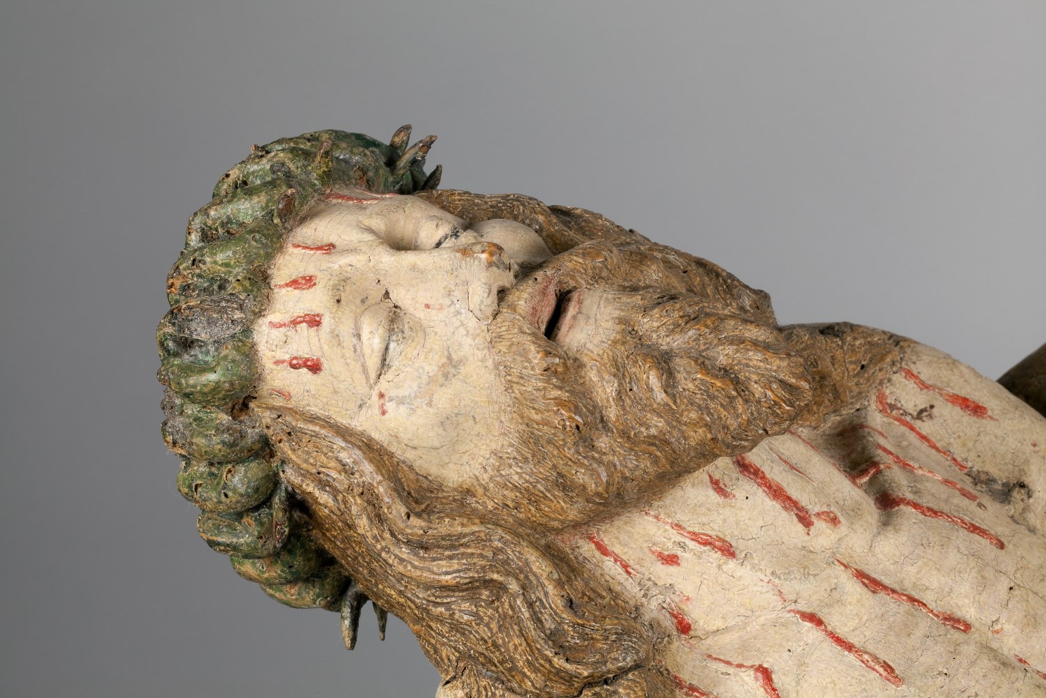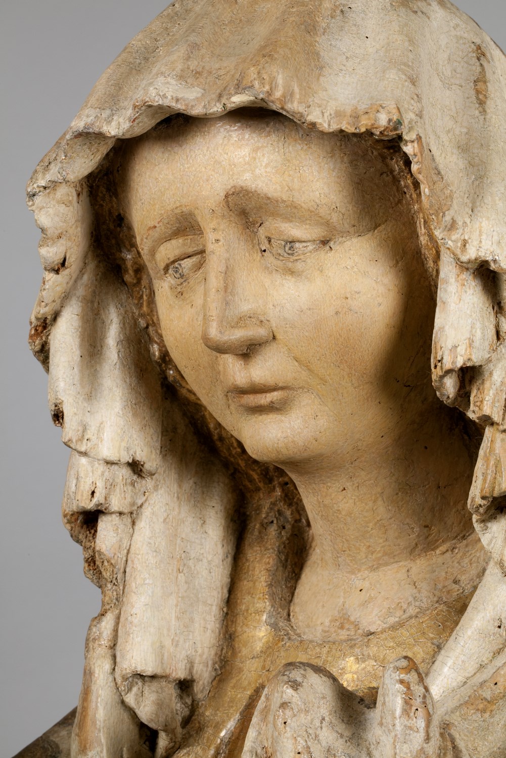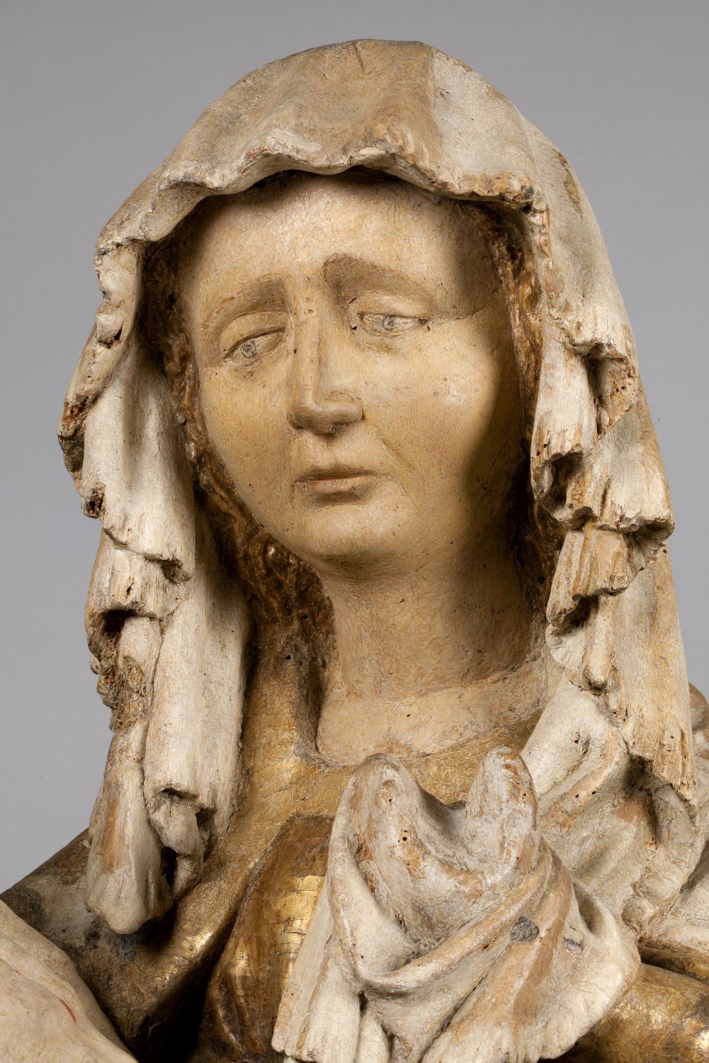Maria zit op een bank en draagt de dode Christus, met het hoofd naar links, op haar schoot. Zijn handen rusten gevouwen op zijn bovenbenen. Hij heeft een gapende wond in zijn rechterzijde. Over zijn lichaam lopen dikke stralen bloed. Maria lijkt haar met haar sluier bedekte linkerhand naar haar gezicht te brengen. Met haar ...