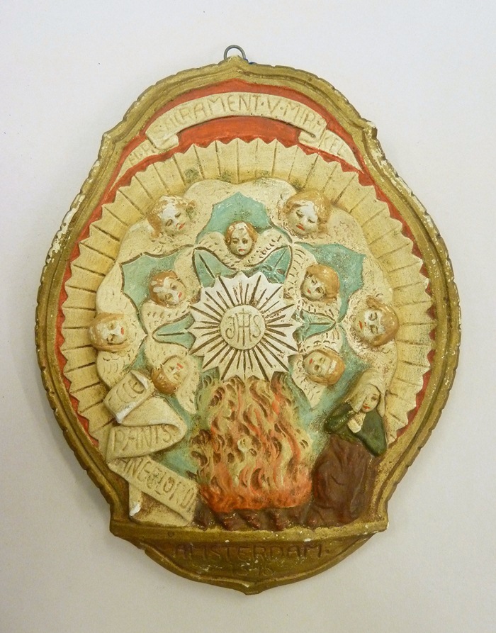 Plaquette met voorstelling sacrament van mirakel te Amsterdam, zwevende hostie, dienstmaagd bij vuur
