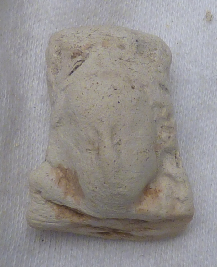 Pijpaarde fragment uit verdronken land van Zuid-Beveland: hoofd van vrouwelijke heilige, Maria(?)