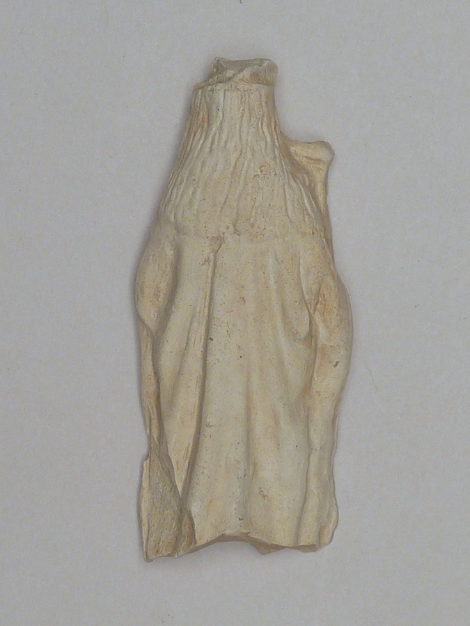 Pijpaarde fragment uit verdronken land van Zuid-Beveland: achterzijde van vrouwelijke heilige
