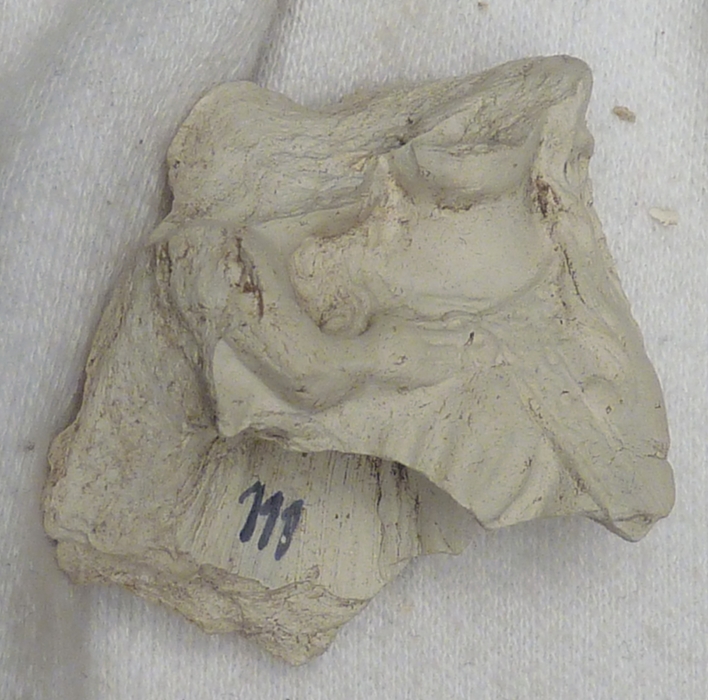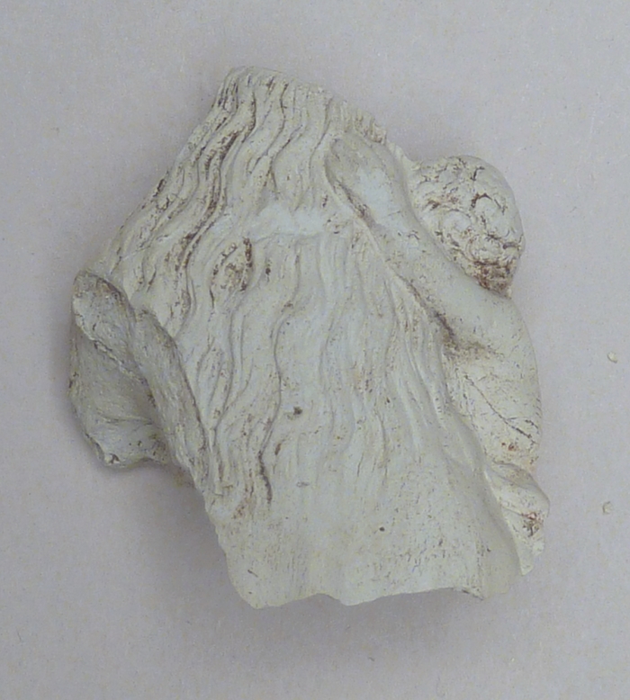 Pijpaarde fragment uit verdronken land van Zuid-Beveland: bovenlijf van Maria met kind op de rechterarm