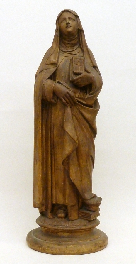 Vrouwelijke heilige, in linkerhand bijbel, in rechterhand ganzeveer, bij linkervoet boek en kroon