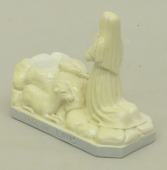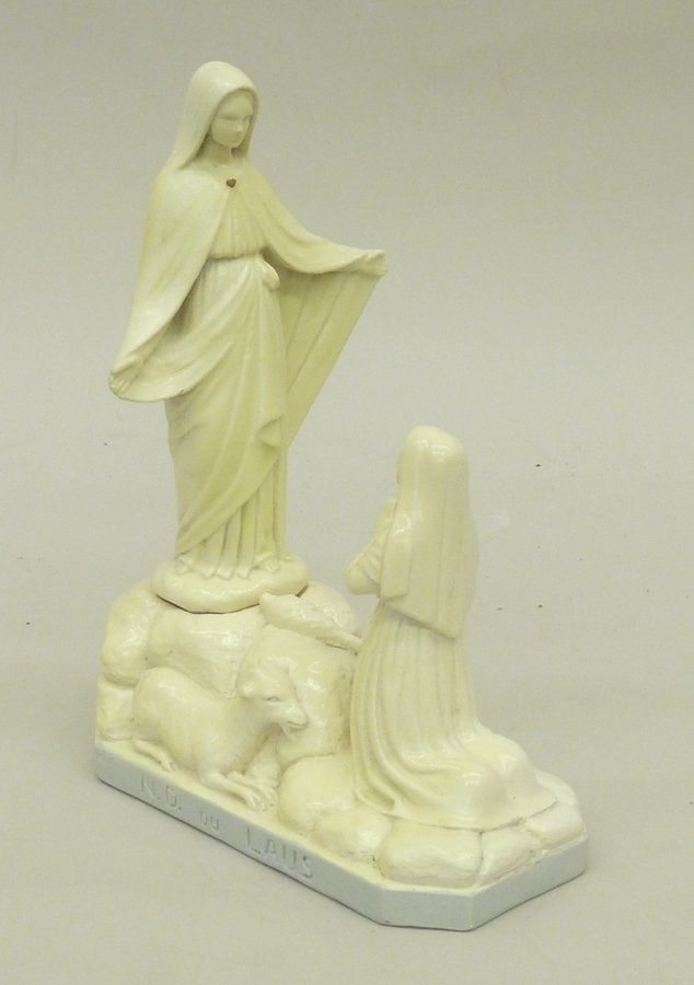 Maria van Laus op heuvel, ervoor knielende Benoite Rencurel, Maria aanbiddend, fluorescerend