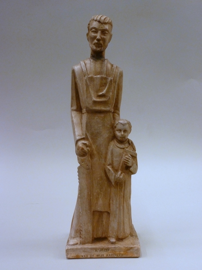 Jozef met Christuskind, rechterhand rust op zaag, aan linkerhand Christus met winkelhaak in armen. met "H. Jozef van de wijk Kapellen"
