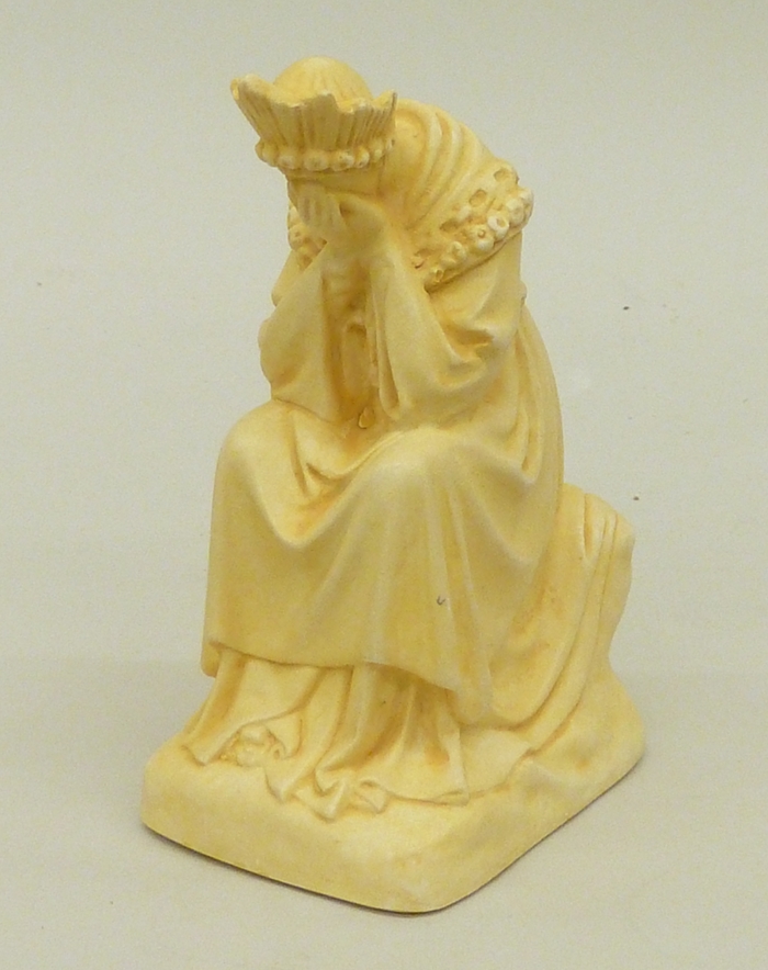 Maria van la Salette, zittend, ellebogen op benen, gezicht huilend in handen verborgen