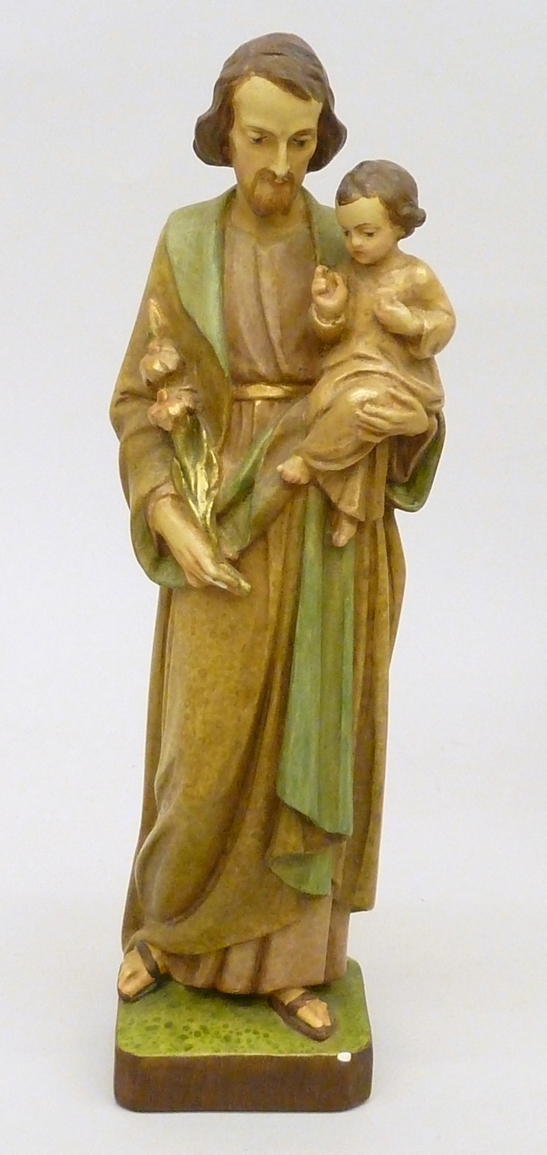 Jozef met Christuskind op linkerarm en lelietak in rechterhand, in groengele mantel