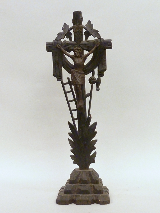 Crucifix op voet met lijdenswerktuigen, geheel bruin geverfd