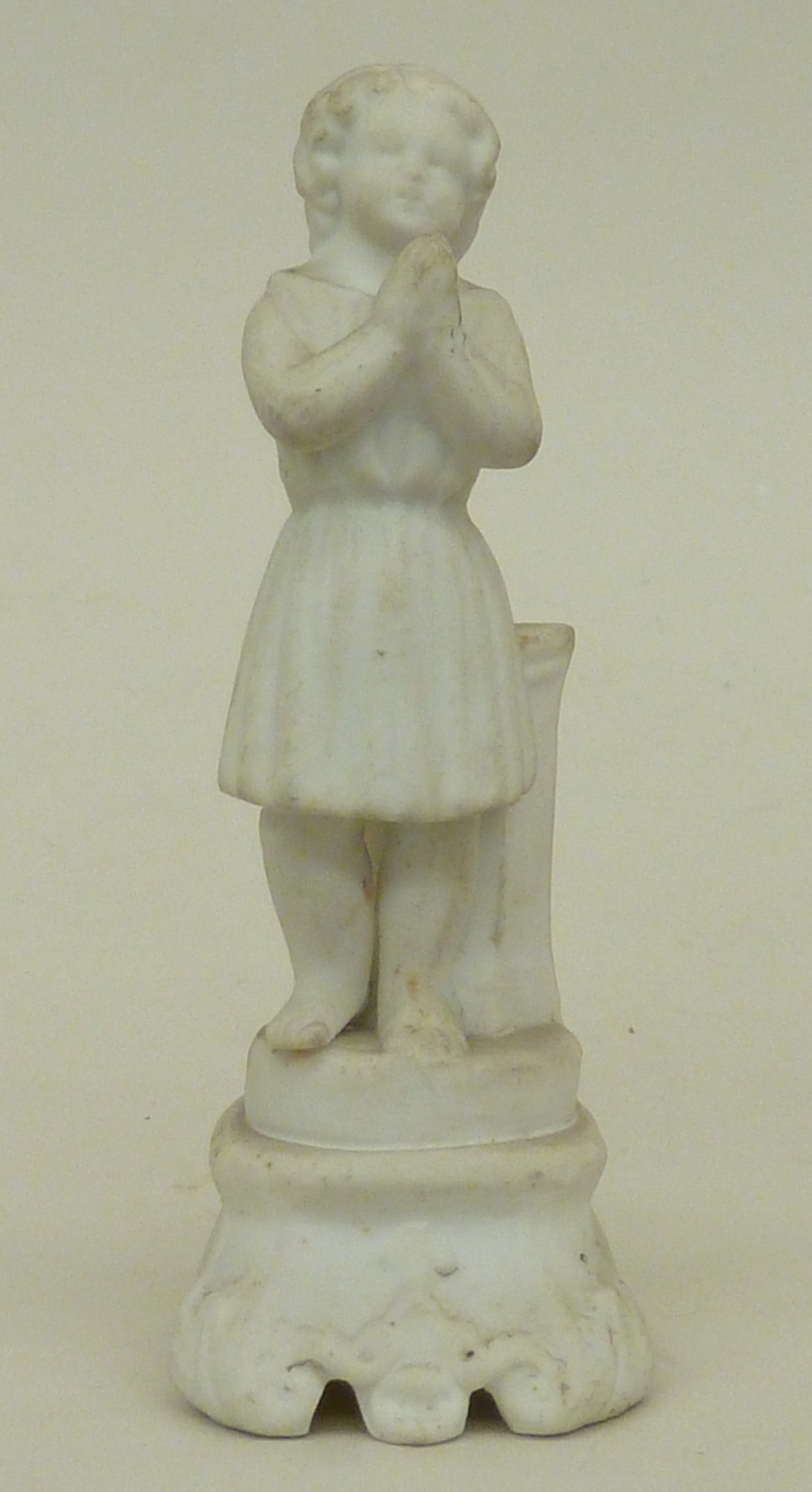 Engeltje in tuniek met gevouwen handen, vleugels afgebroken