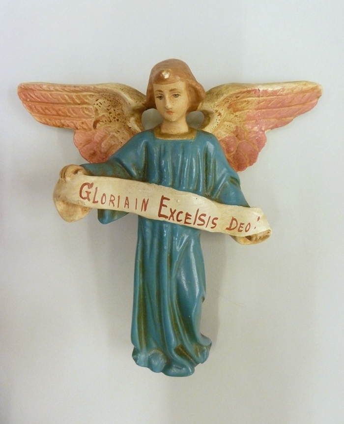Engel in blauw gewaad met banderol met "Gloria in excelsis deo"