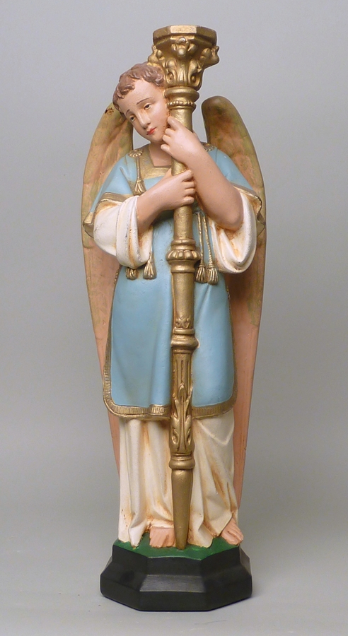 Staande engel gekleed in een lichtblauwe dalmatiek, met gouden kandelaar