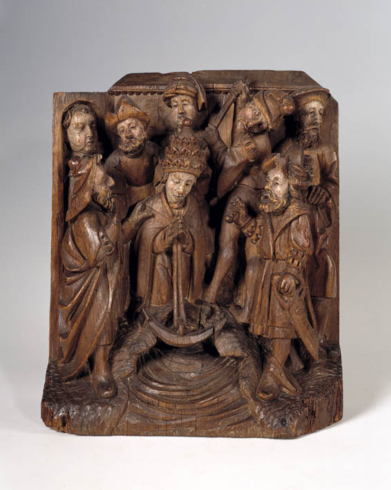 Voorgesteld is het moment waarop paus Clemens met een anker om de hals in zee wordt geworpen. In het midden knielt hij op een rots. Het touw van het anker hangt tussen zijn gevouwen handen naar beneden tot boven de golven. Rechts achter hem staat een man met een lange stok in beide handen, die ...